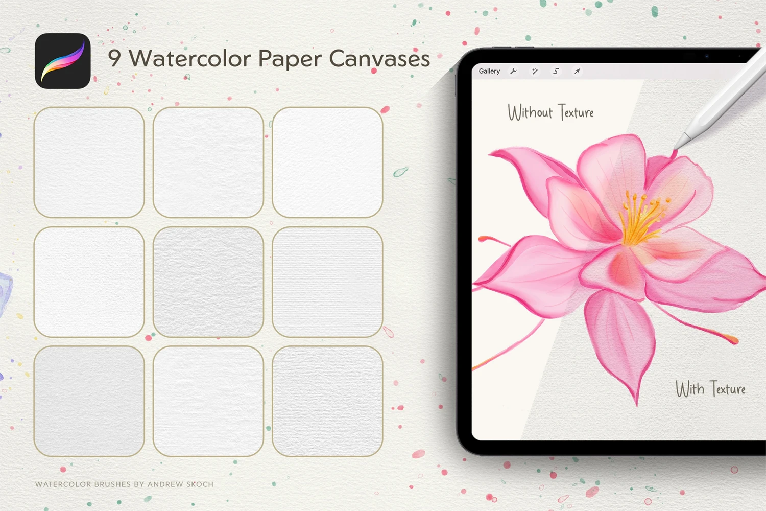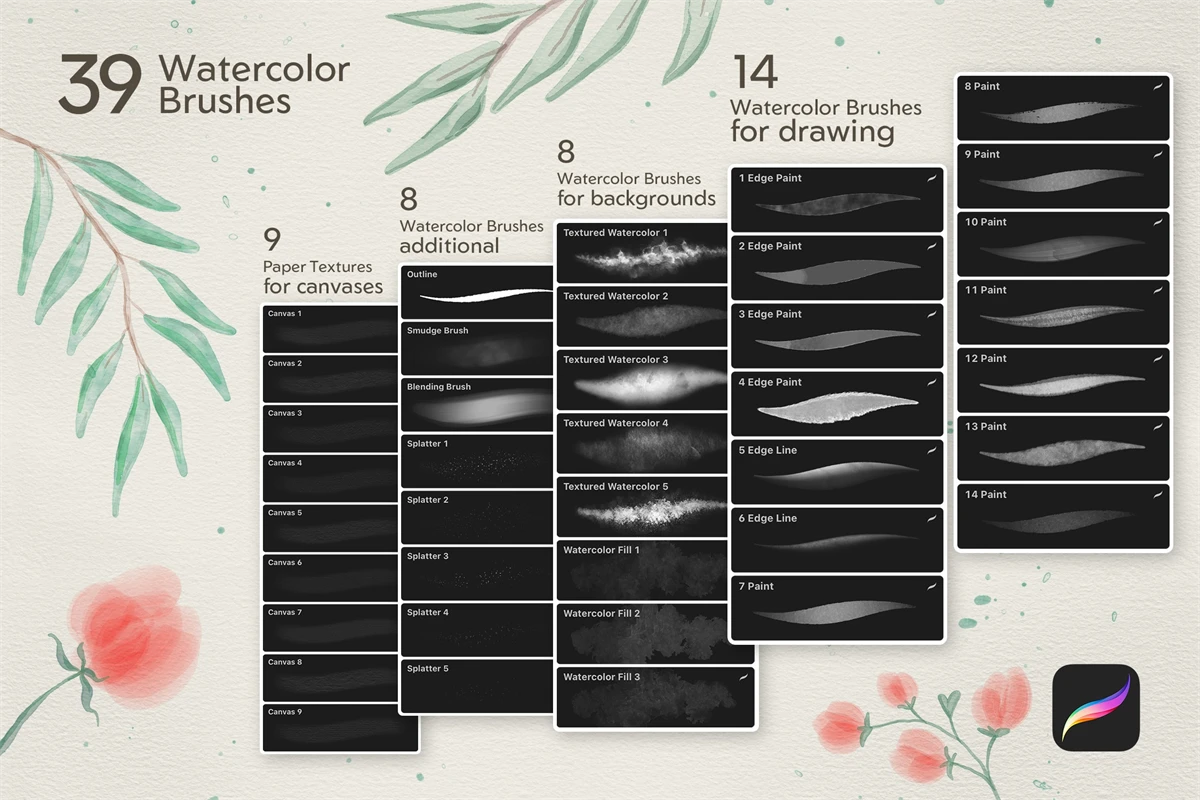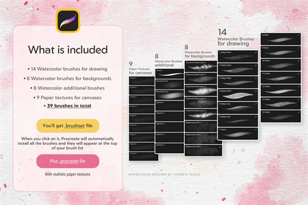 With 39 brushes in a single .brushset file and 9 paper canvases included in a .procreate file, you have all the tools necessary to capture every nuance of watercolour painting. Enjoy the process of creating with these realistic brushes, perfect for both detailed illustrations and expressive washes.