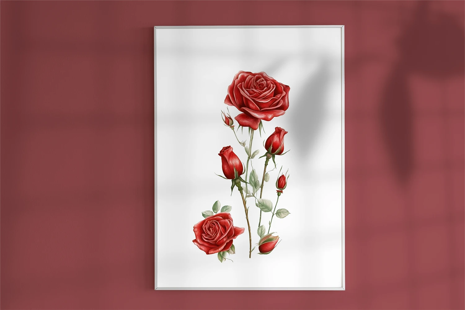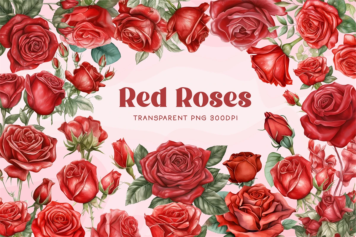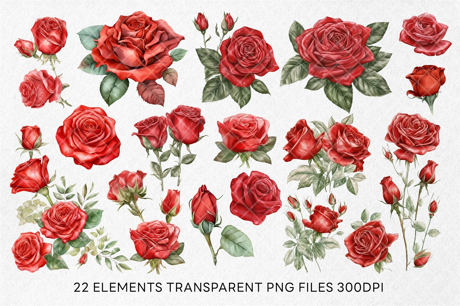 Delicate Red Roses Watercolor, Sublimation Clipart, Floral Designs, Wedding Invitations. All elements are high-resolution (300dpi) PNG files with transparent backgrounds.