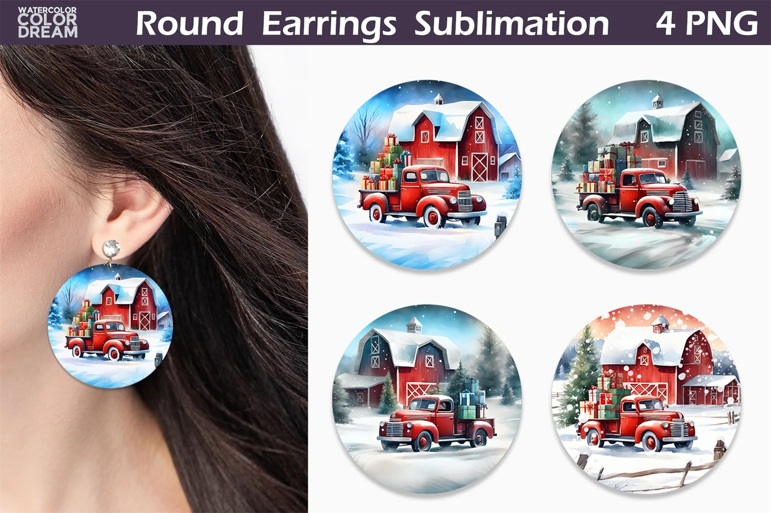 Red Truck Round Earrings. Christmas Earrings Sublimation