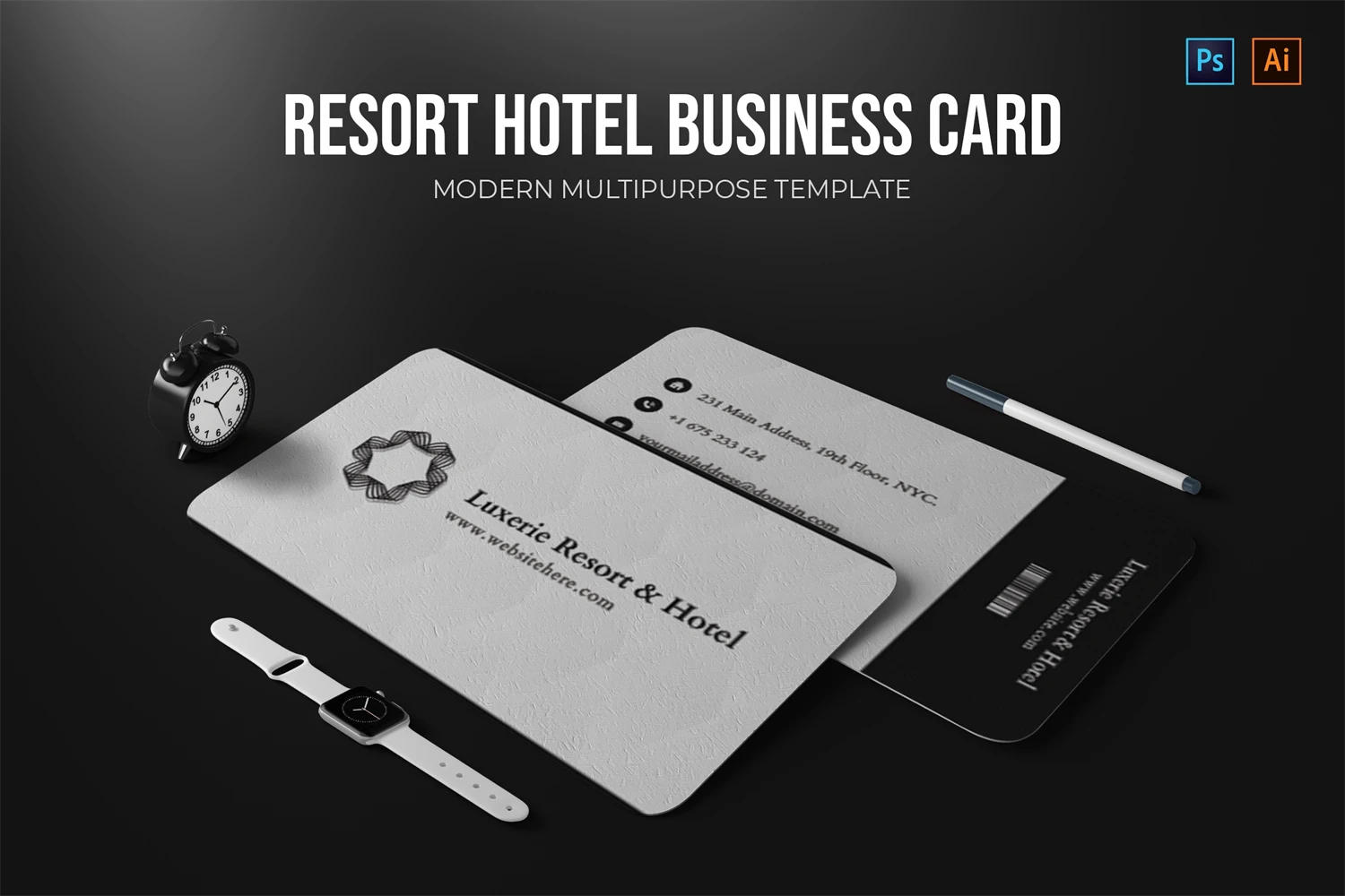 This Resort Hotel - Business Card make your business cards look professional. You can use this business card for, identity, company business cards, Corporate Business, Creative, Blogs, Photographers, Artists, Designers, etc.