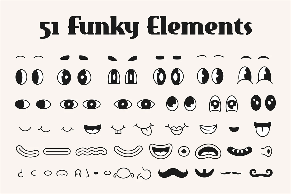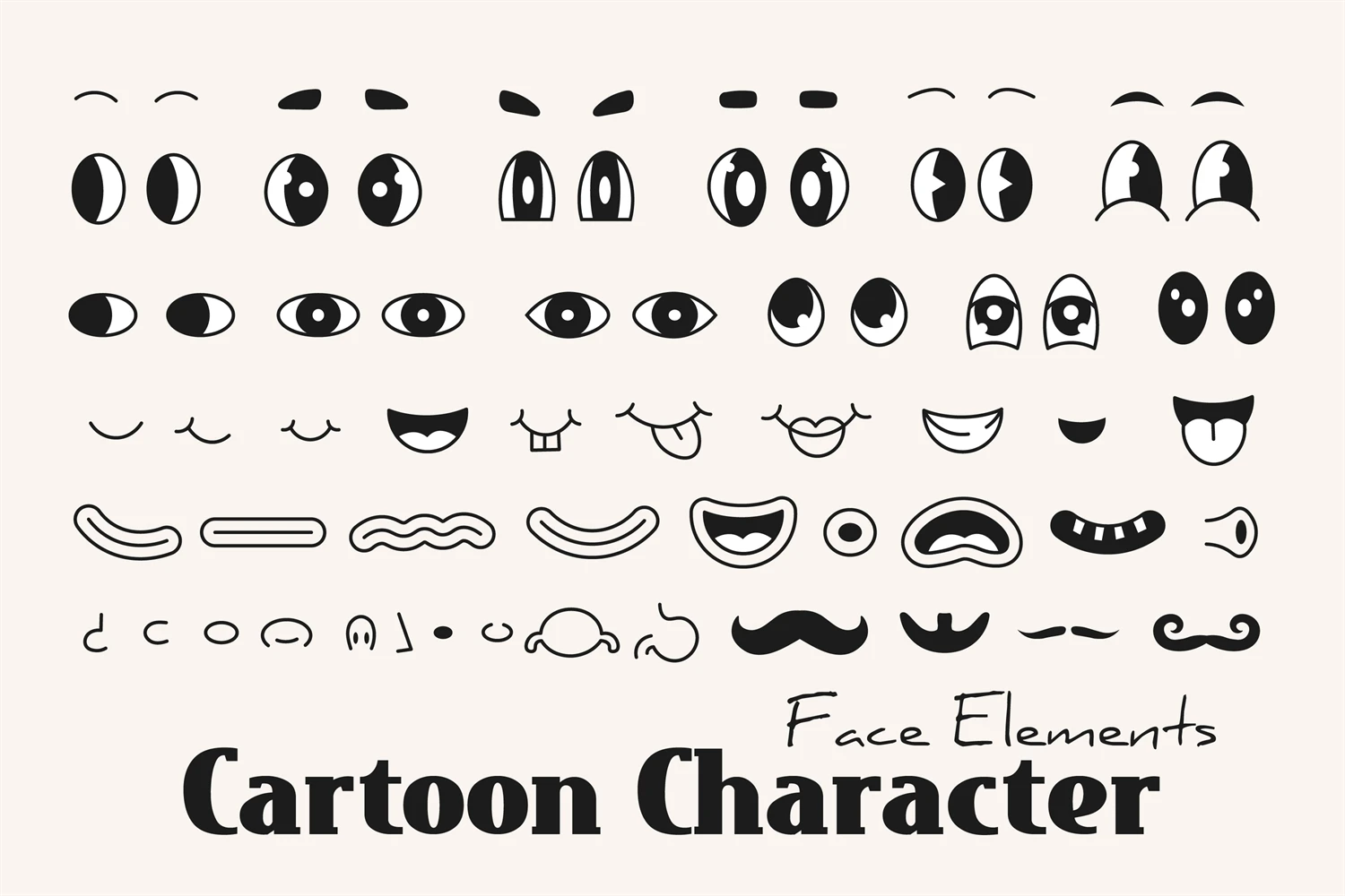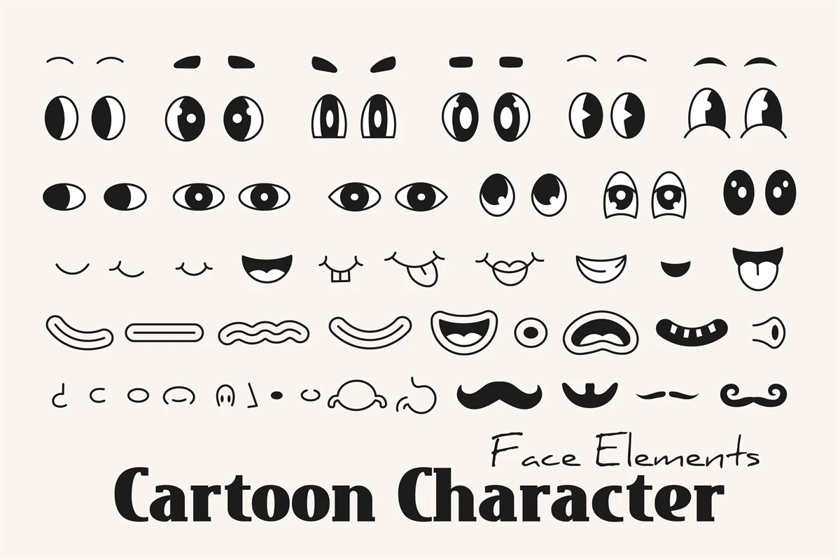 Retro classic cartoon face elements for funky mascot and character design. Black and white vintage eyes, mouth, nose, mustache, brows and lips. Facial expression constructor. Character creator. Vector illustration. 30s, 40s, 50s, 60s aesthetics.