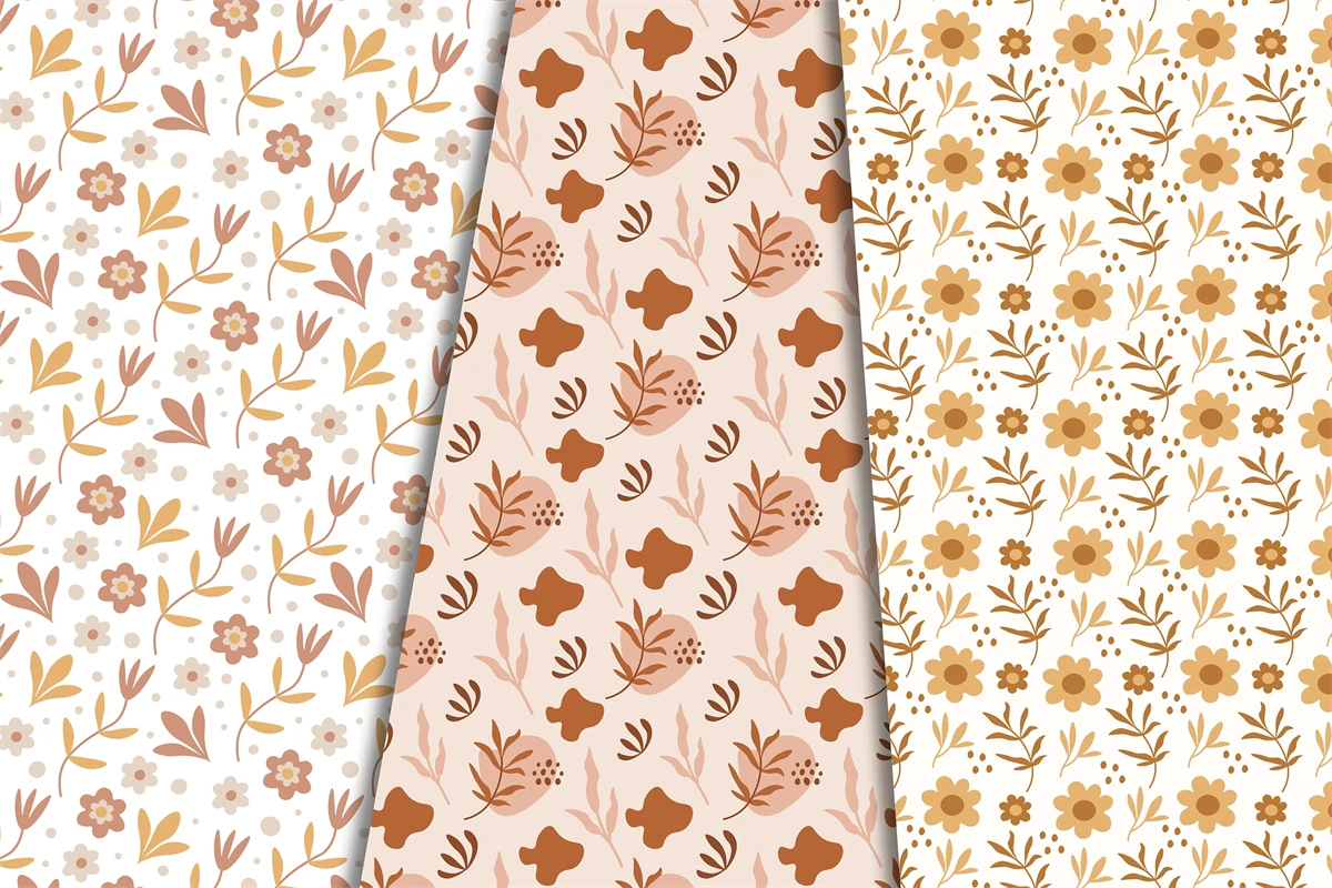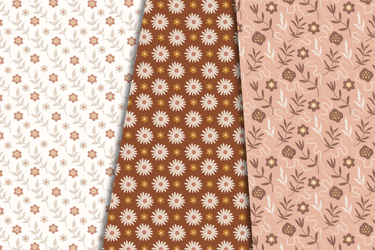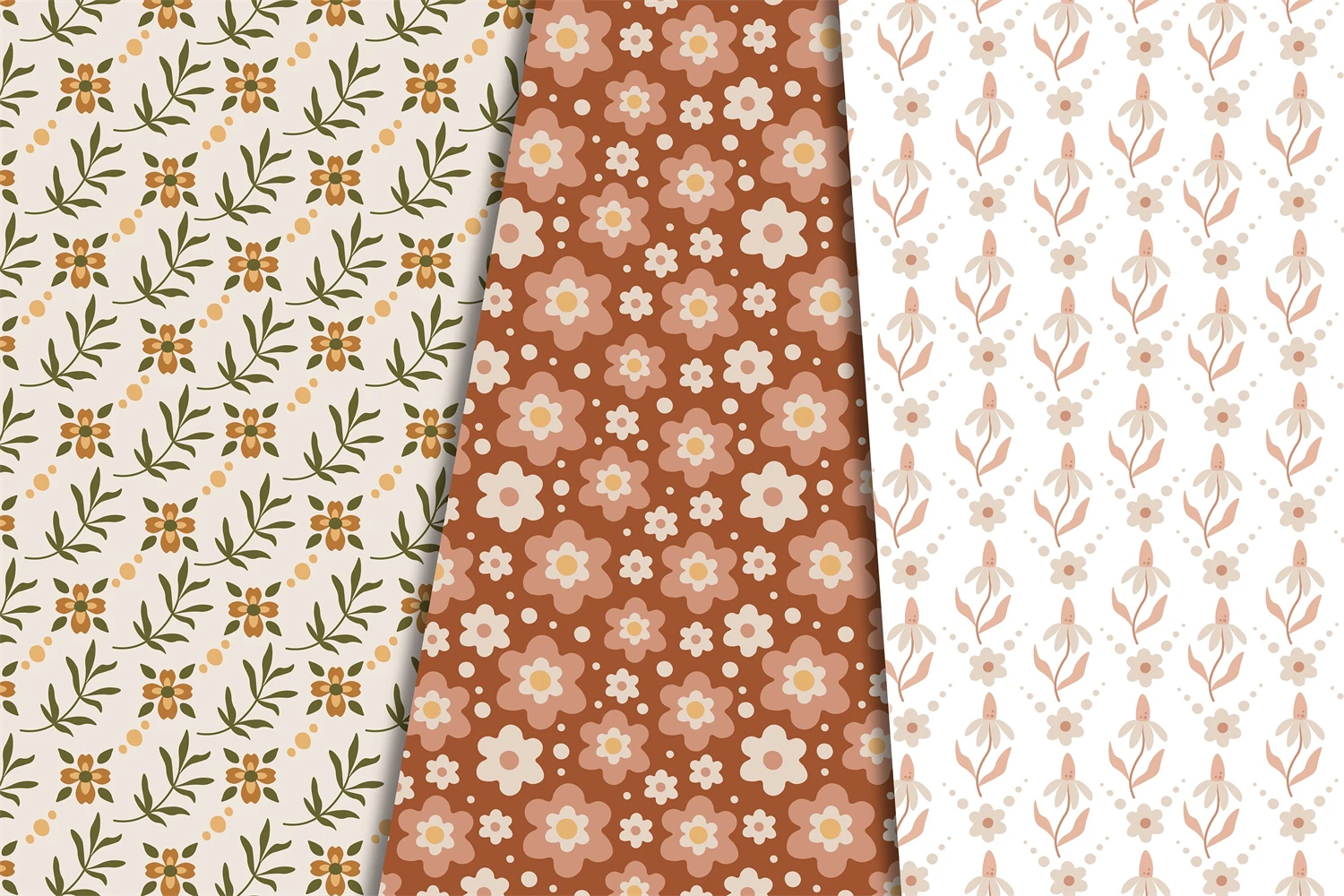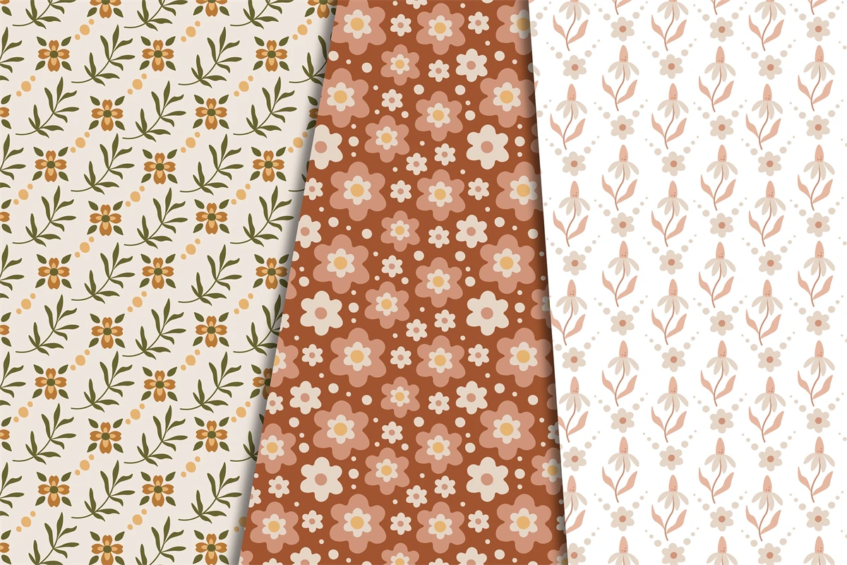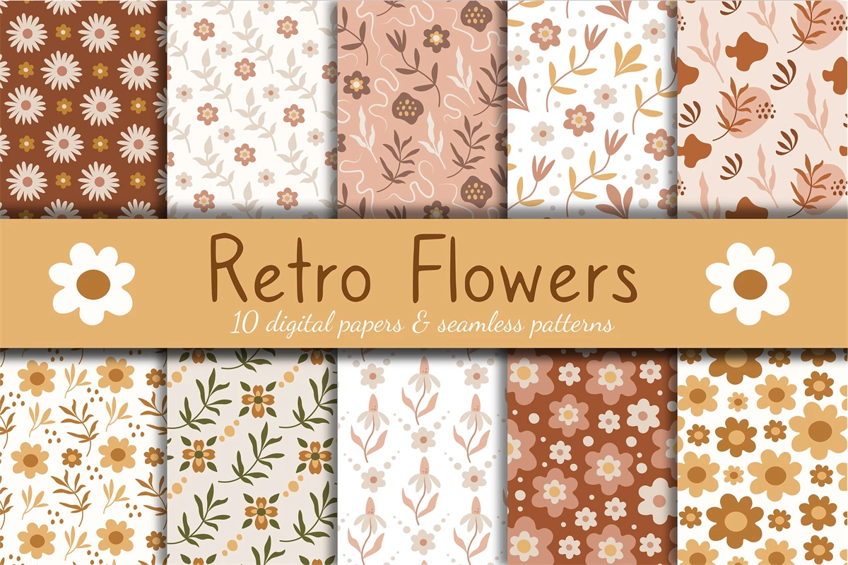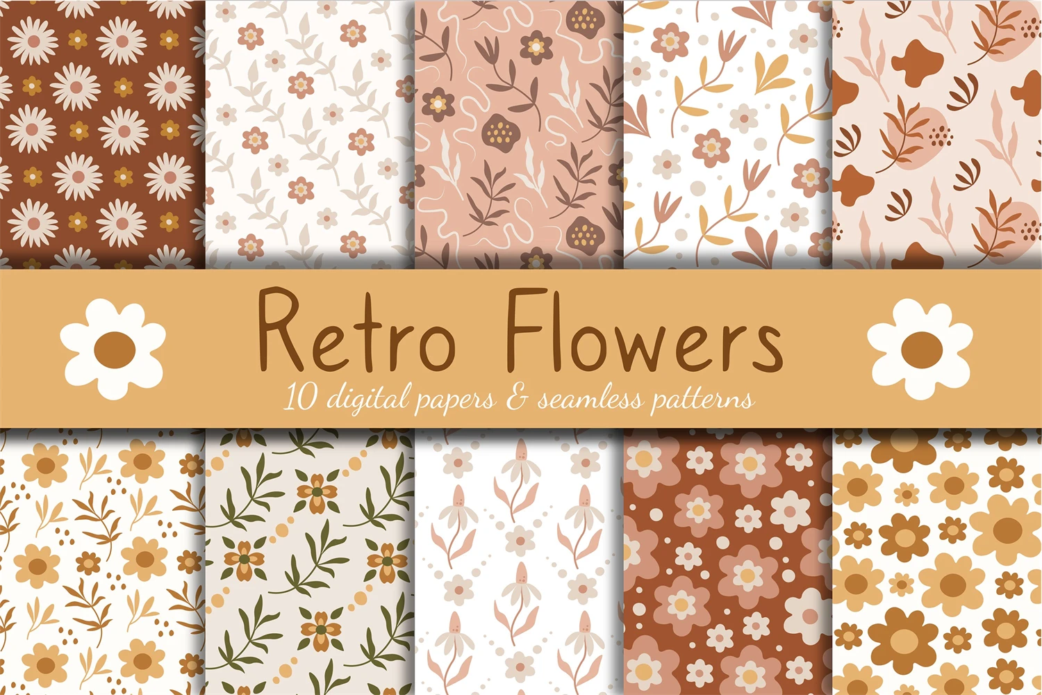 Retro Flowers digital papers & seamless patterns collection includes 10 cute floral ornaments with vintage blossoms and leaves. Beautiful elegant seamless backgrounds are perfect for greeting cards, textile, fabric, scrapbooking, products packaging, accessories, wrapping paper, gifts, wallpaper, etc.