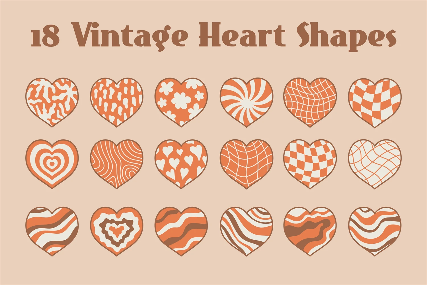 18 Trendy Groovy Heart shape bundle in retro style. Vintage aesthetic for Valentines day and Wedding design. Modern vintage collection of wavy hearts with outline. Grid, gingham, marble, melting, distorted, liquid and fluid checkered texture. 60s and 70s hippie style for invitation, greeting card, poster, banner, sublimation, stickers. Vector illustration. Retro romantic design elements. Love symbols.