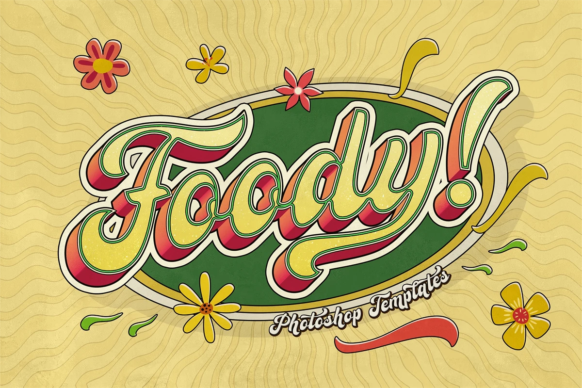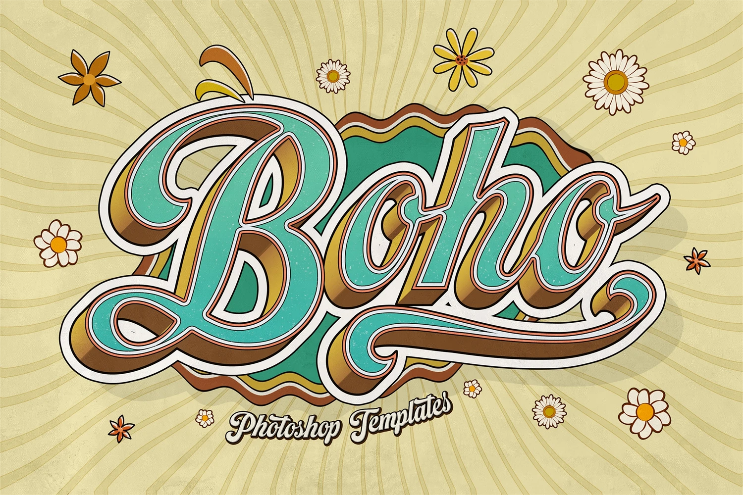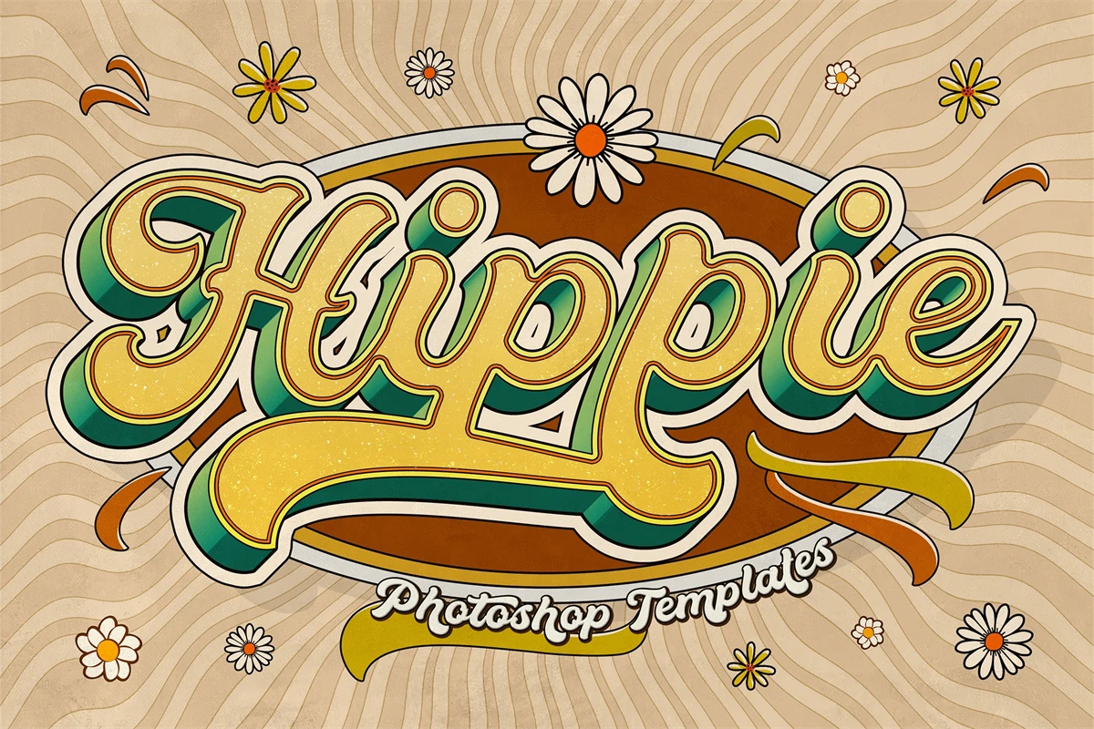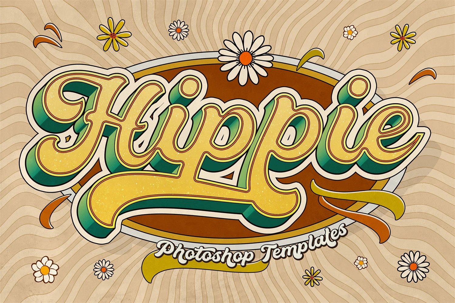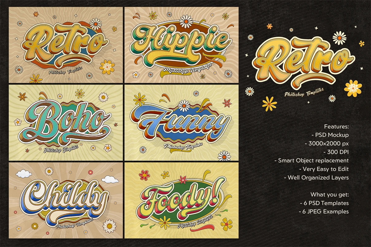 Colorful 3D effects for your texts, logos, shapes etc. Retro hippie style with bright colors and floral decor. You can use these 6 Photoshop templates for making cool retro lettering for posters, social media, video titles, Instagram, promo, ads and more!