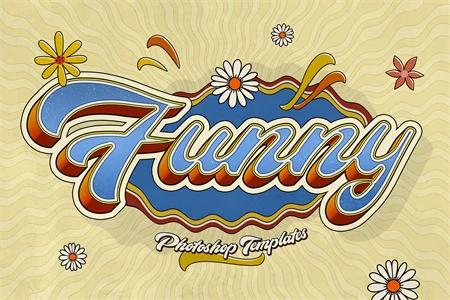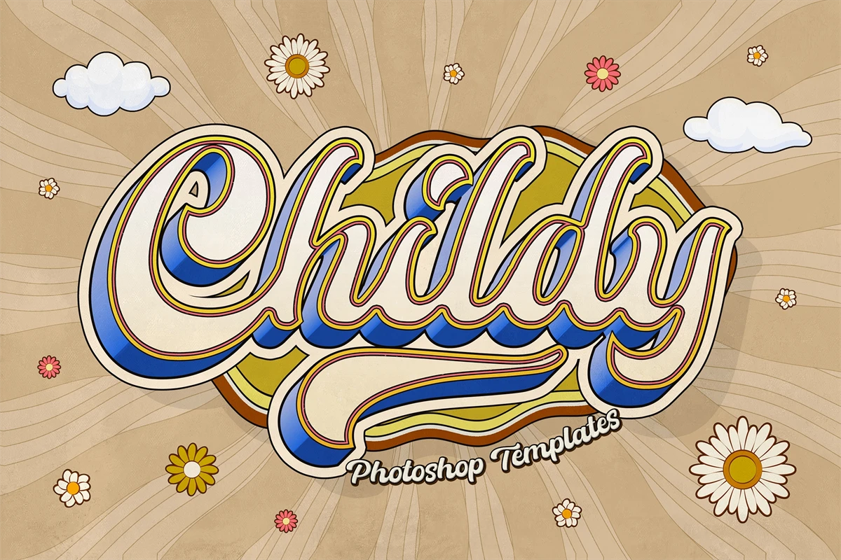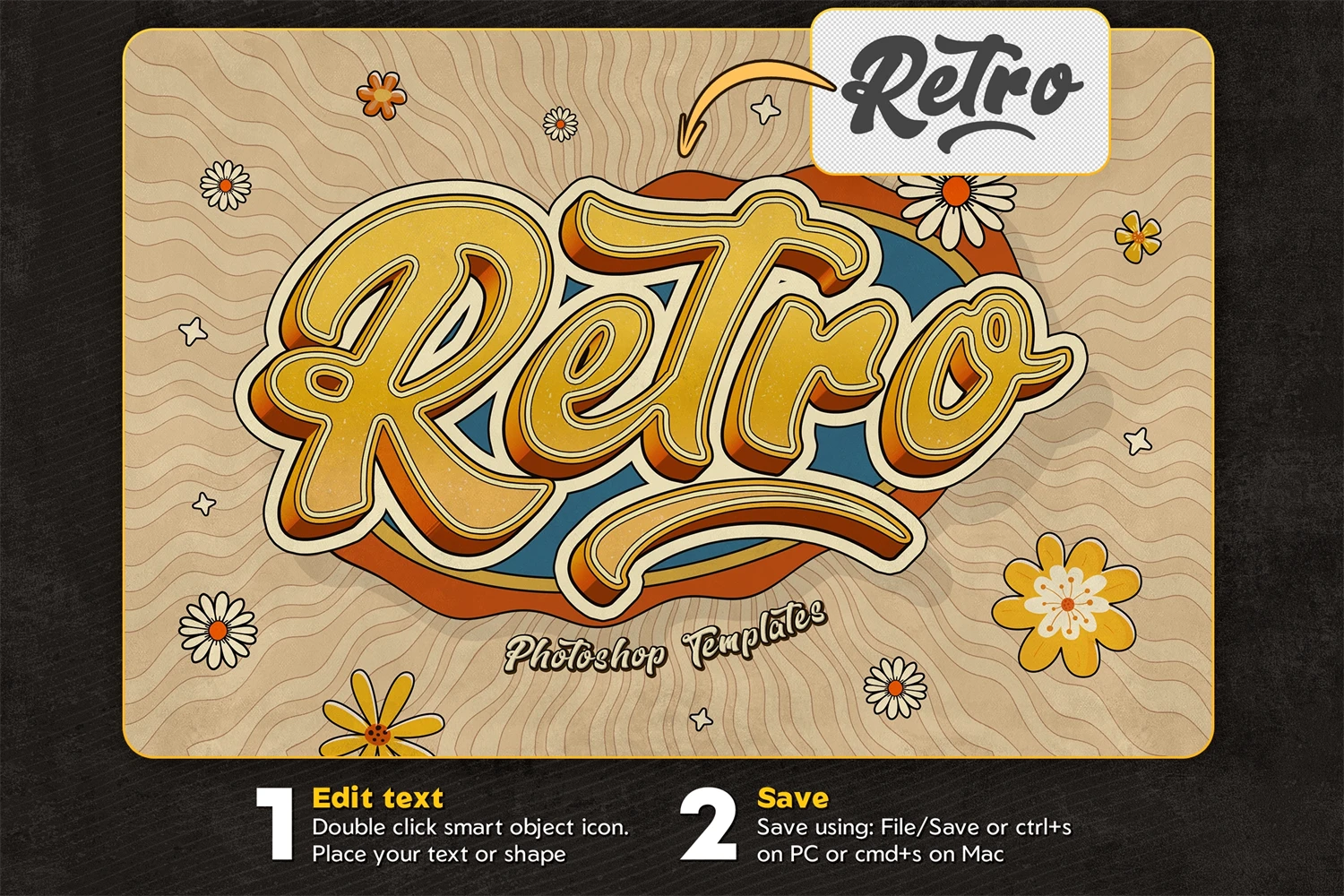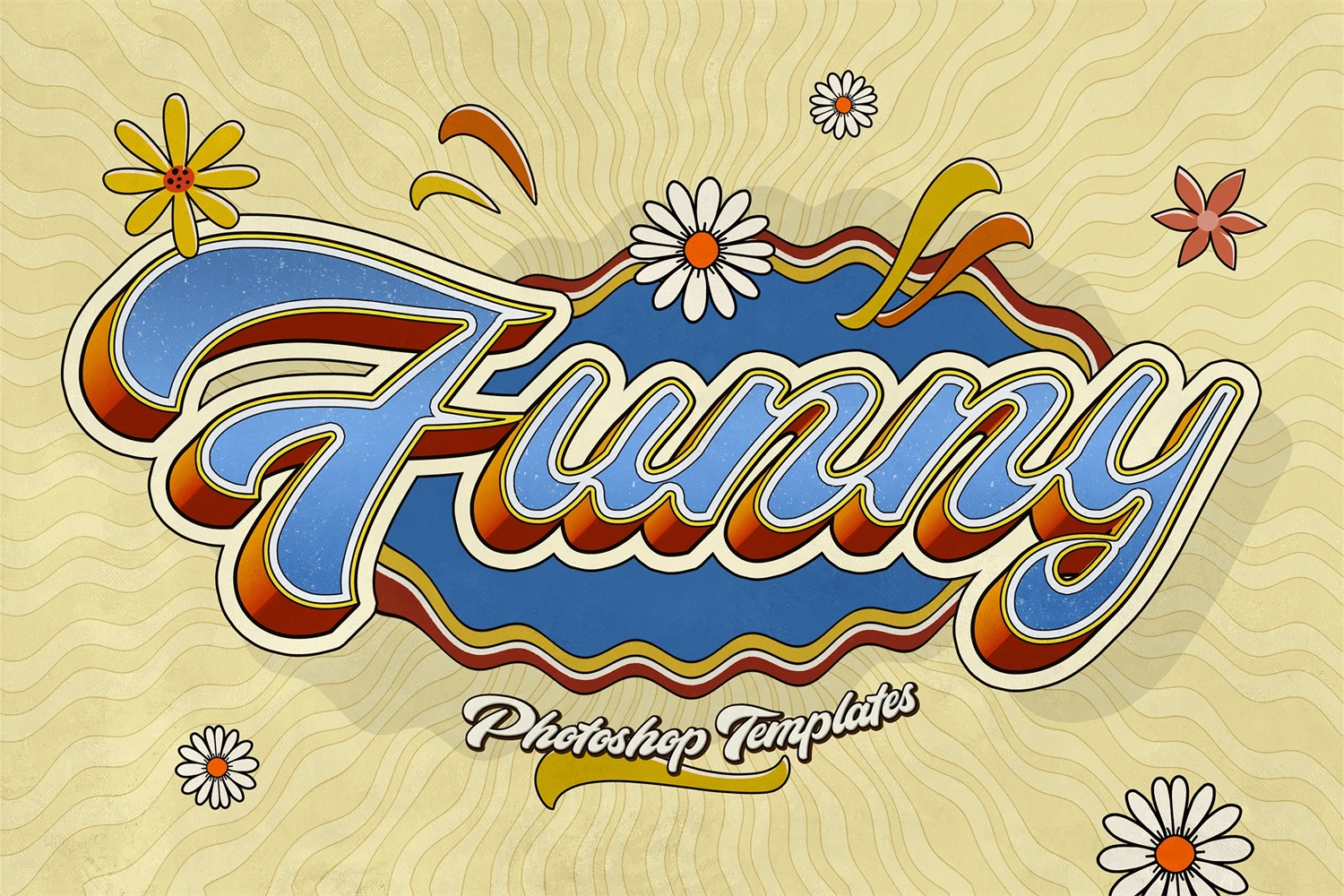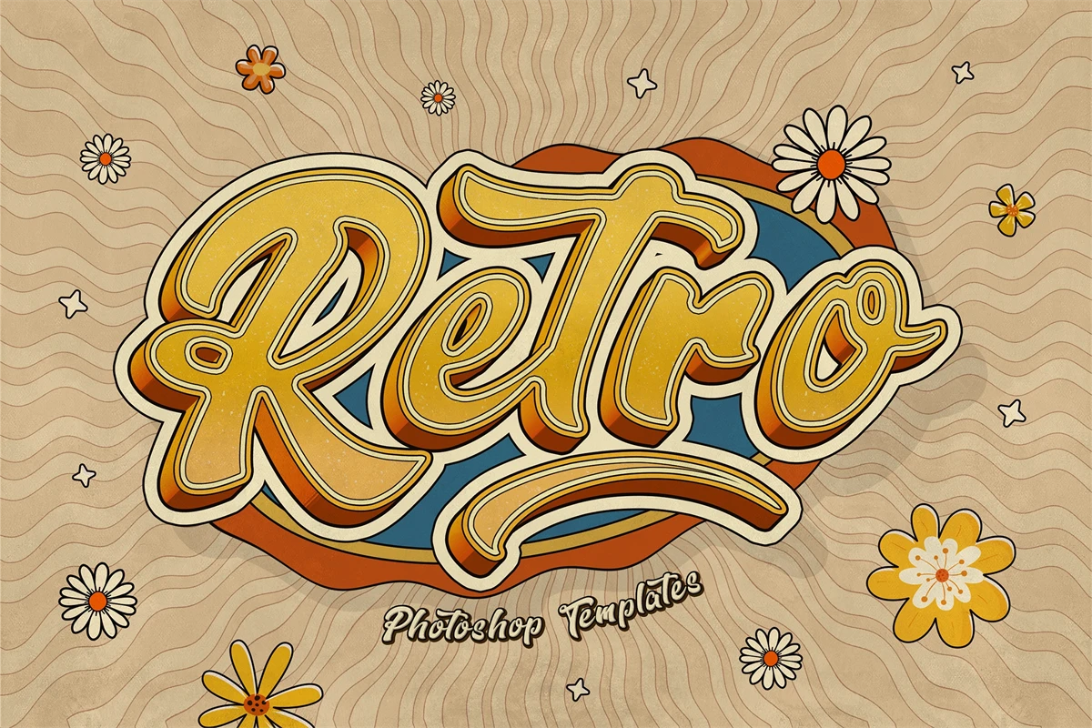 Colorful 3D effects for your texts, logos, shapes etc. Retro hippie style with bright colors and floral decor. You can use these 6 Photoshop templates for making cool retro lettering for posters, social media, video titles, Instagram, promo, ads and more!