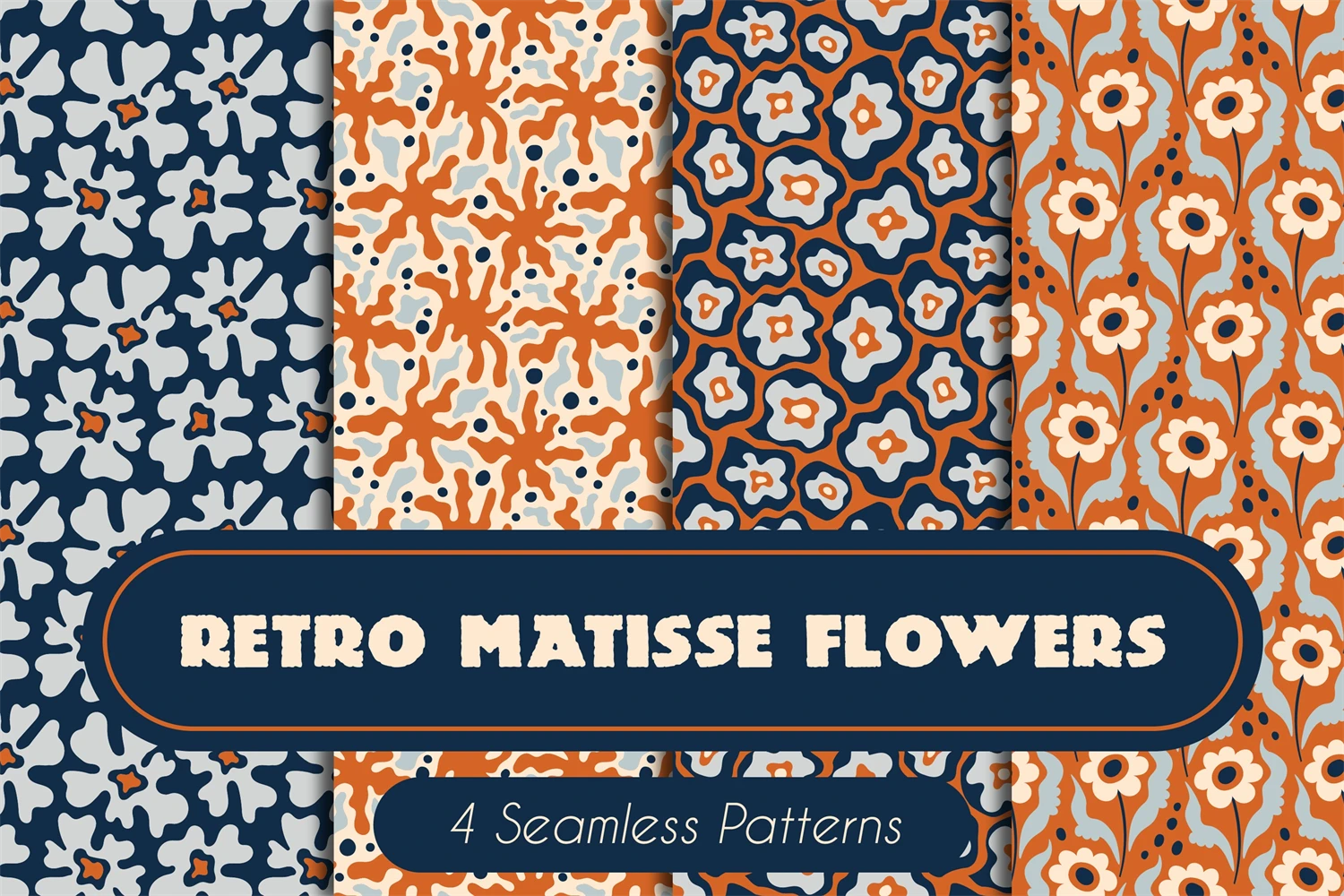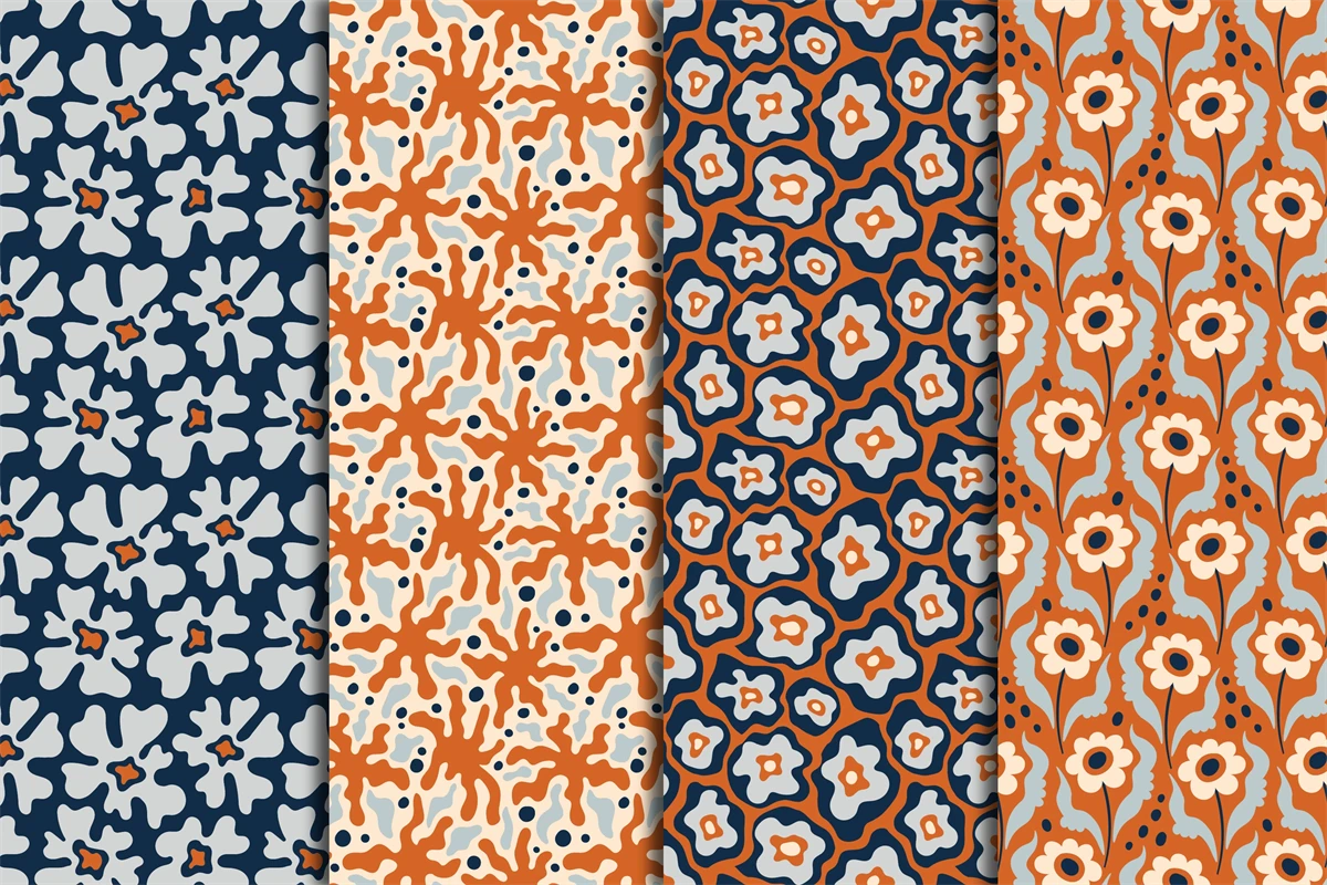 Trendy minimal floral seamless patterns collection. Retro Matisse inspired abstract flowers. Contemporary endless backgrounds with groovy blossoms, dots, liquid leaves and organic shapes. Curvy botanical design for autumn, fall, summer fashion, fabric, textile, wrapping paper, greeting card, etc.