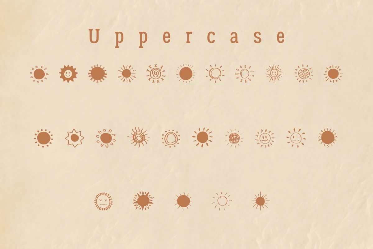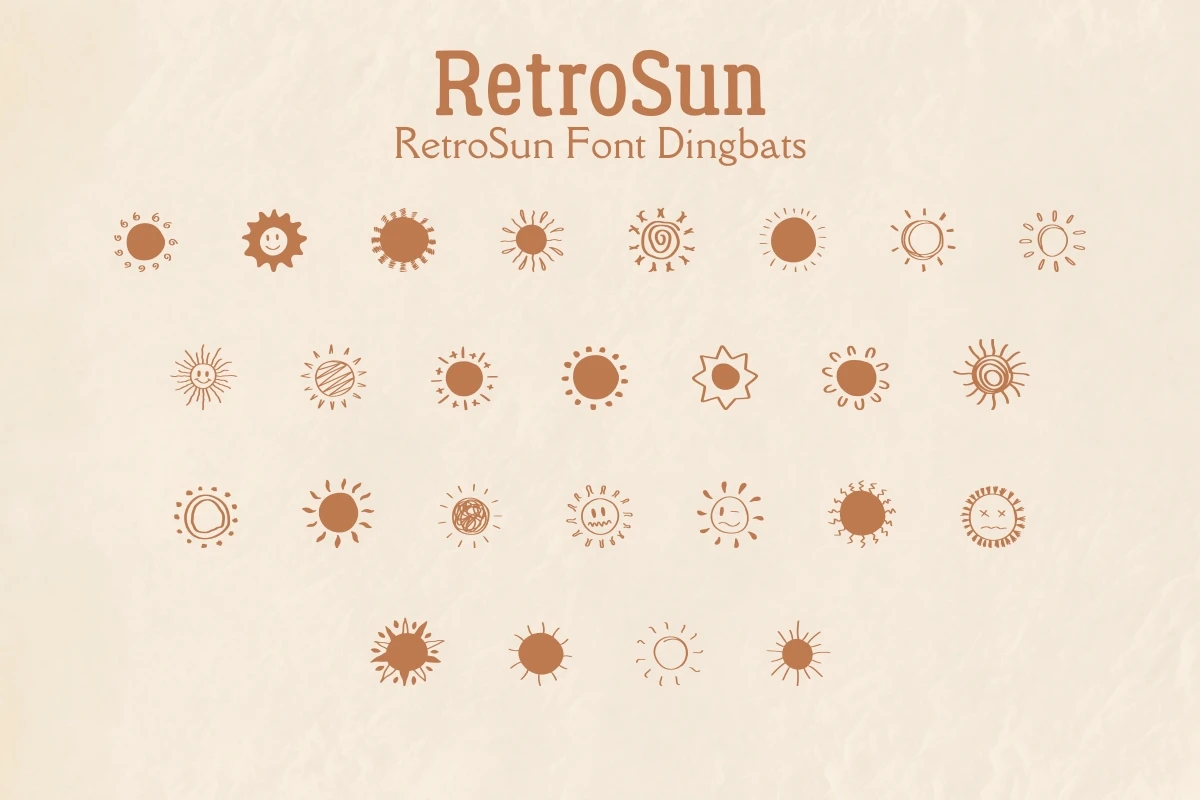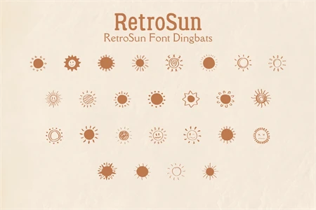 Retro Sun is a dingbat font containing upper and lower case glyphs, Retro Sun dingbat font is suitable for decorative fonts, childrens books, stickers, and book covers.