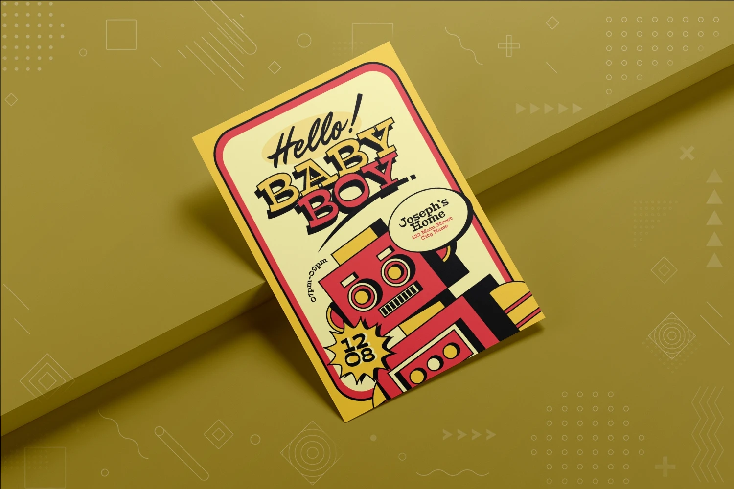 A **Retro Toys Baby Shower Invitation** can be used for your baby shower or baby's birthday. You could also use it as a promotion for baby and parent photography services. Match the needs, whether personal or business. This template is easy to adjust and easy for you to edit according to your taste.