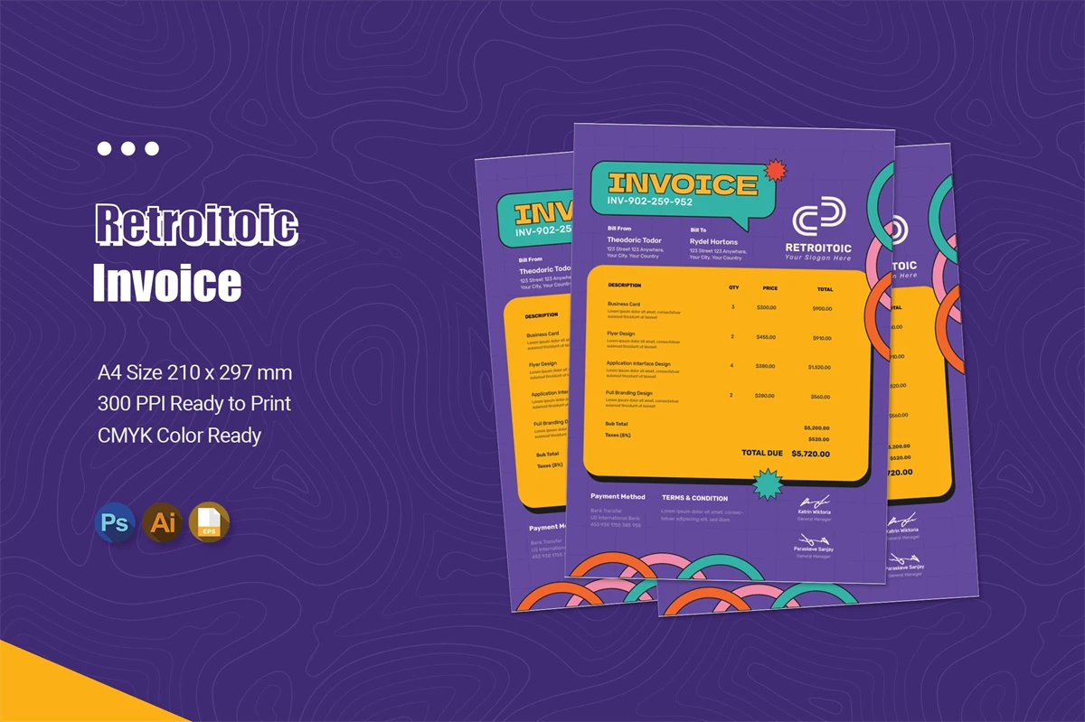 Use our invoices to make your bookkeeping easier and to impress your clients with an invoice display that has a modern, elegant design and strong typography. This invoice template is easy to use and customizable, making it perfect for any medium.