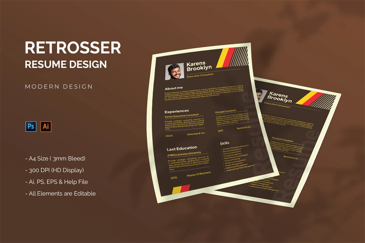 This is **Retrosser - Resume Template** Get it now!, CV Resume for All business and personal needs. This design is great for your business and will make your interest, elegant, and easily editable according to your needs (**Adobe Illustrator, Adobe Photoshop**). You can use this CV Resume for personal purposes, or company purposes, I hope you enjoy this, Hope you Like it, and dont forget to rate it, Thanks.