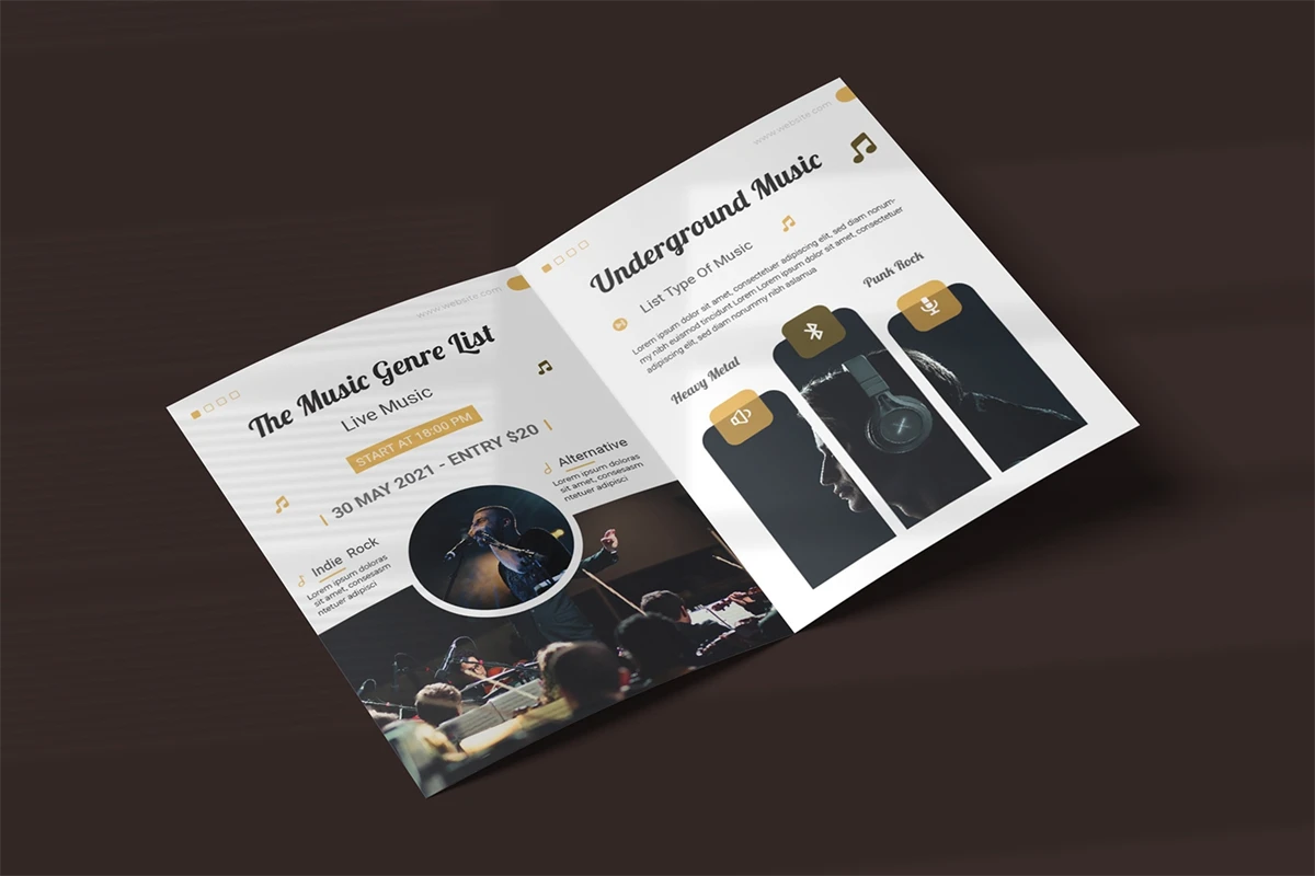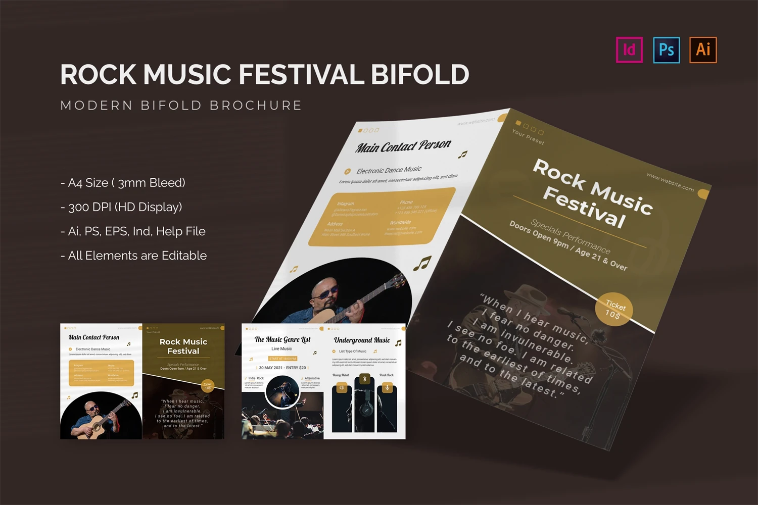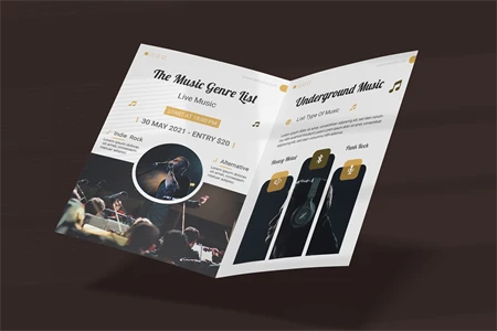 Rock Music Festival - Bifold Brochure We present this Bifold Brochure for you, simple and very elegant, and this Bifold Brochure is suitable for all types of your business, made with Adobe InDesign (INDD), Adobe Photoshop (PSD) and Adobe Illustrator (AI), very easy to customize, Hope you Like it, dont forget to rate, Thanks.