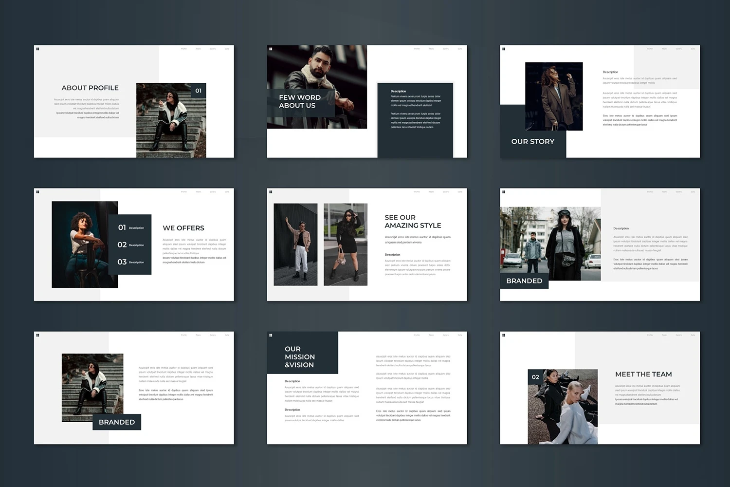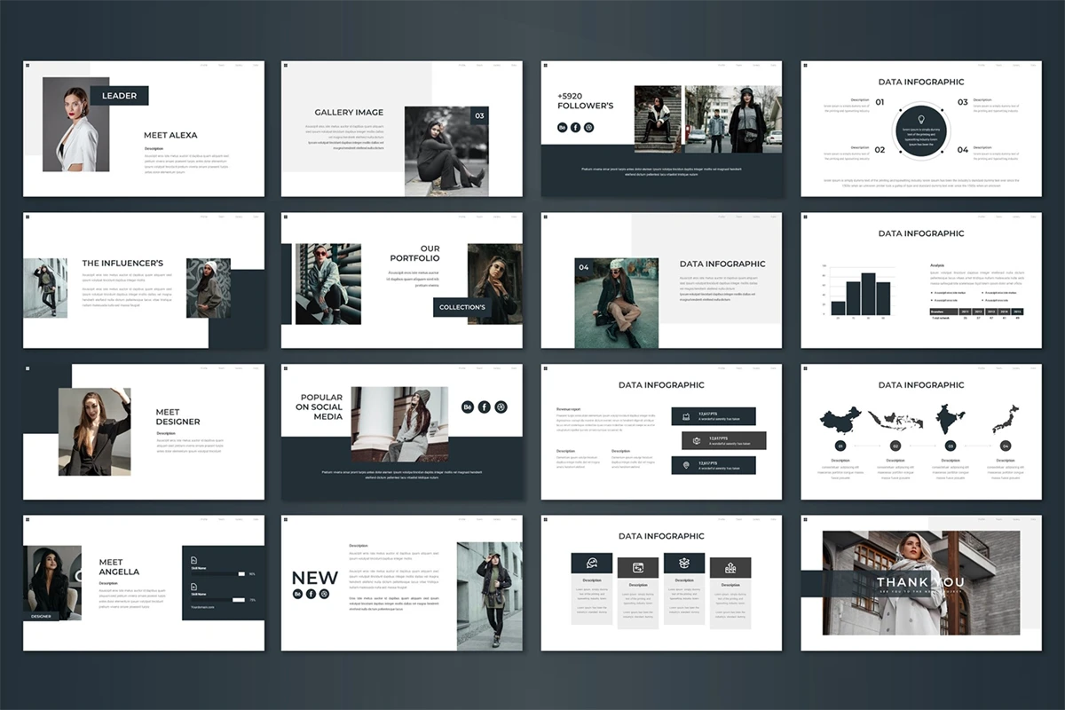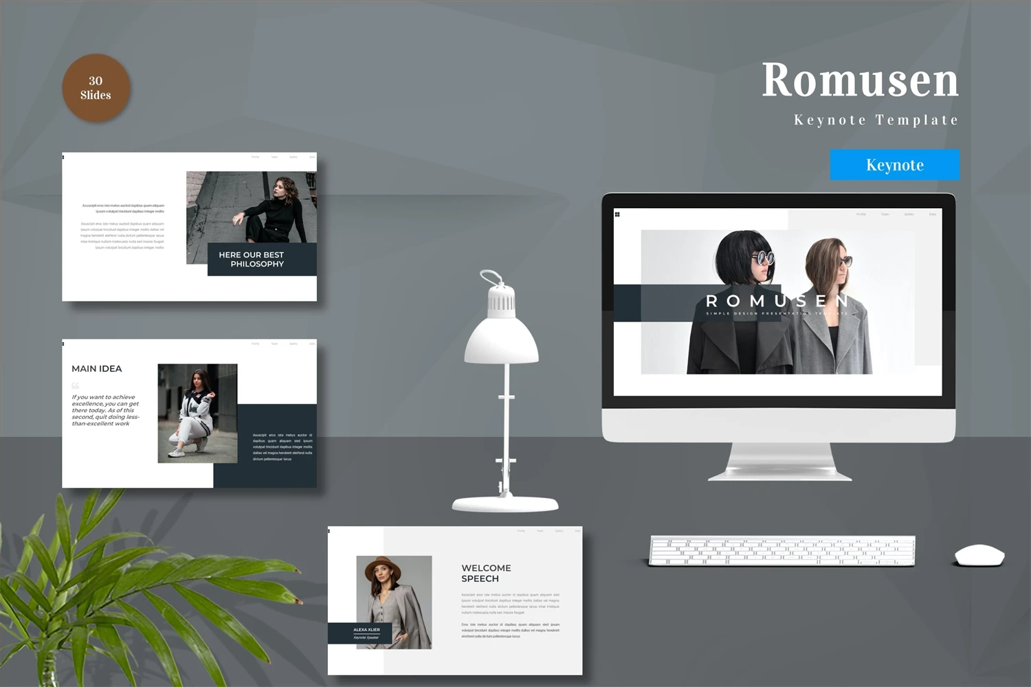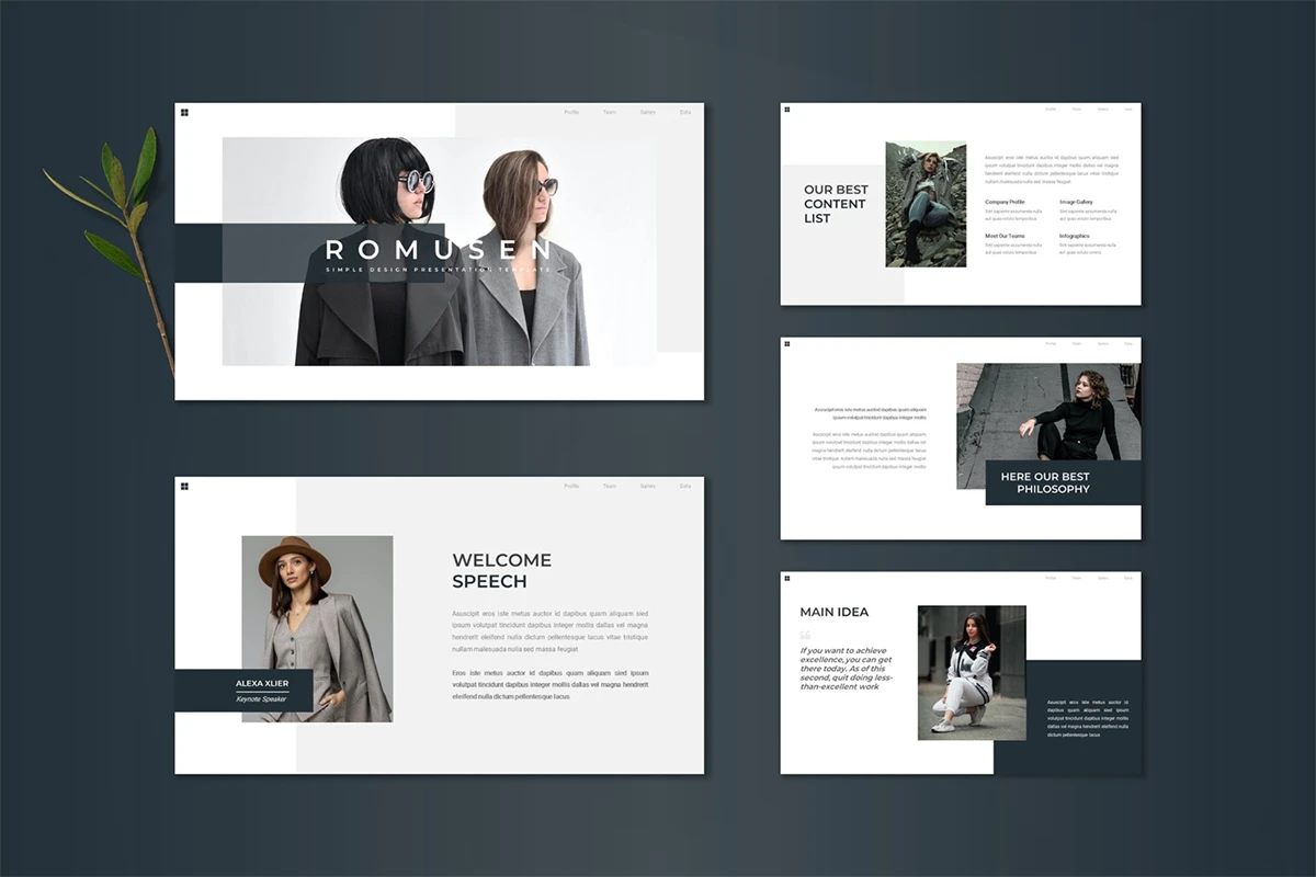 Get it now! **Romusen - Keynote Template** for All Business and Personal Needs All elements on this template are editable; input your content, replace your image with a placeholder, change the color, and all presentations include an animated slide to present your slides.