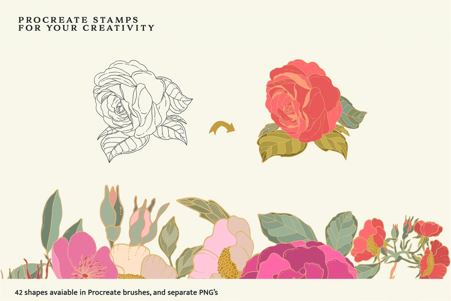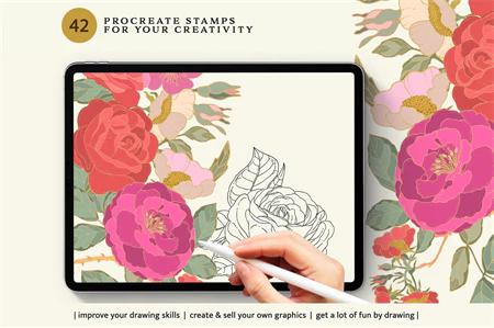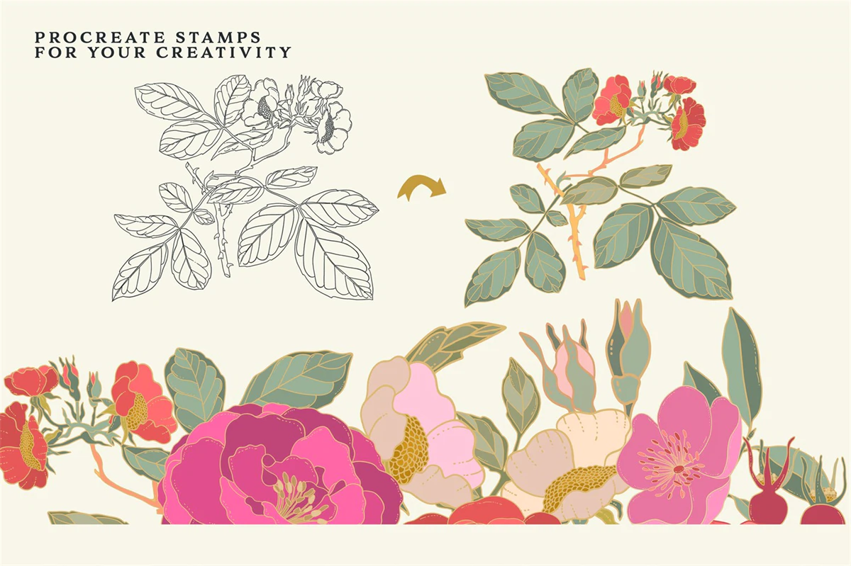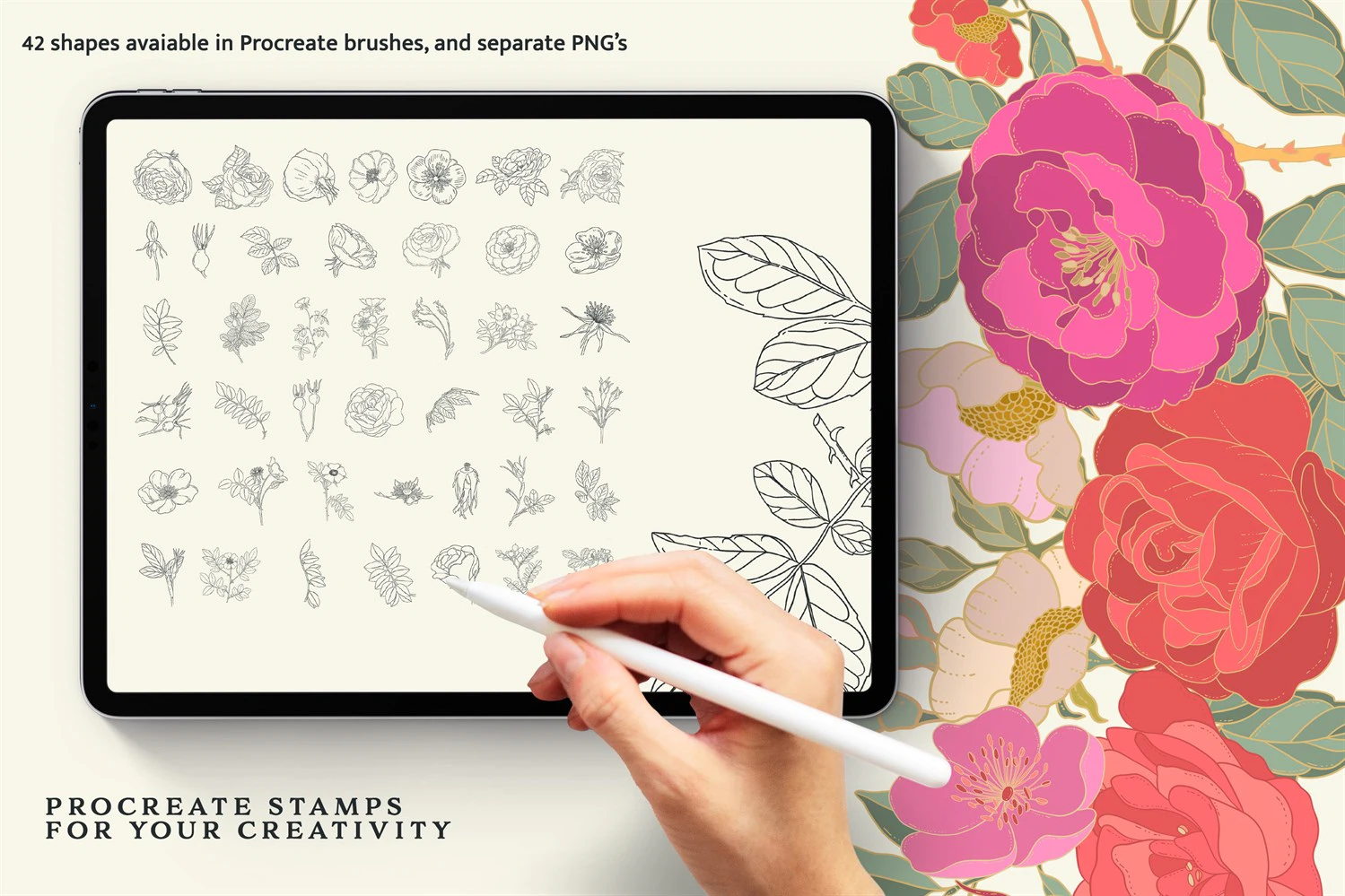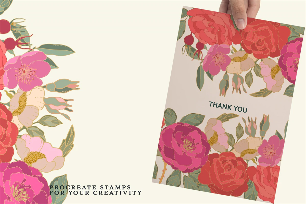 The poppy stamp brush set for Procreate is a digital brush used in the Procreate app that creates botanical designs with a single stamp. These stamps can be easily imported into the app and applied to artwork or illustrations, providing a quick way to add detailed elements to a design. They are a useful tool for artists and designers looking to add decorative elements to their digital artwork. The brush can be customized in size, opacity, and color, making it a versatile tool for creative projects