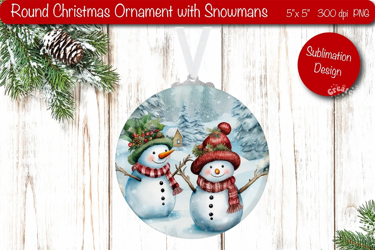 Round Christmas ornament sublimation with a cute Watercolor Snowman PNG. Cute Christmas Sublimation Round Ornament! Adorable snowmen, vibrant colors, and lasting memories. Perfect for your tree or as a delightful gift. Happy holidays!