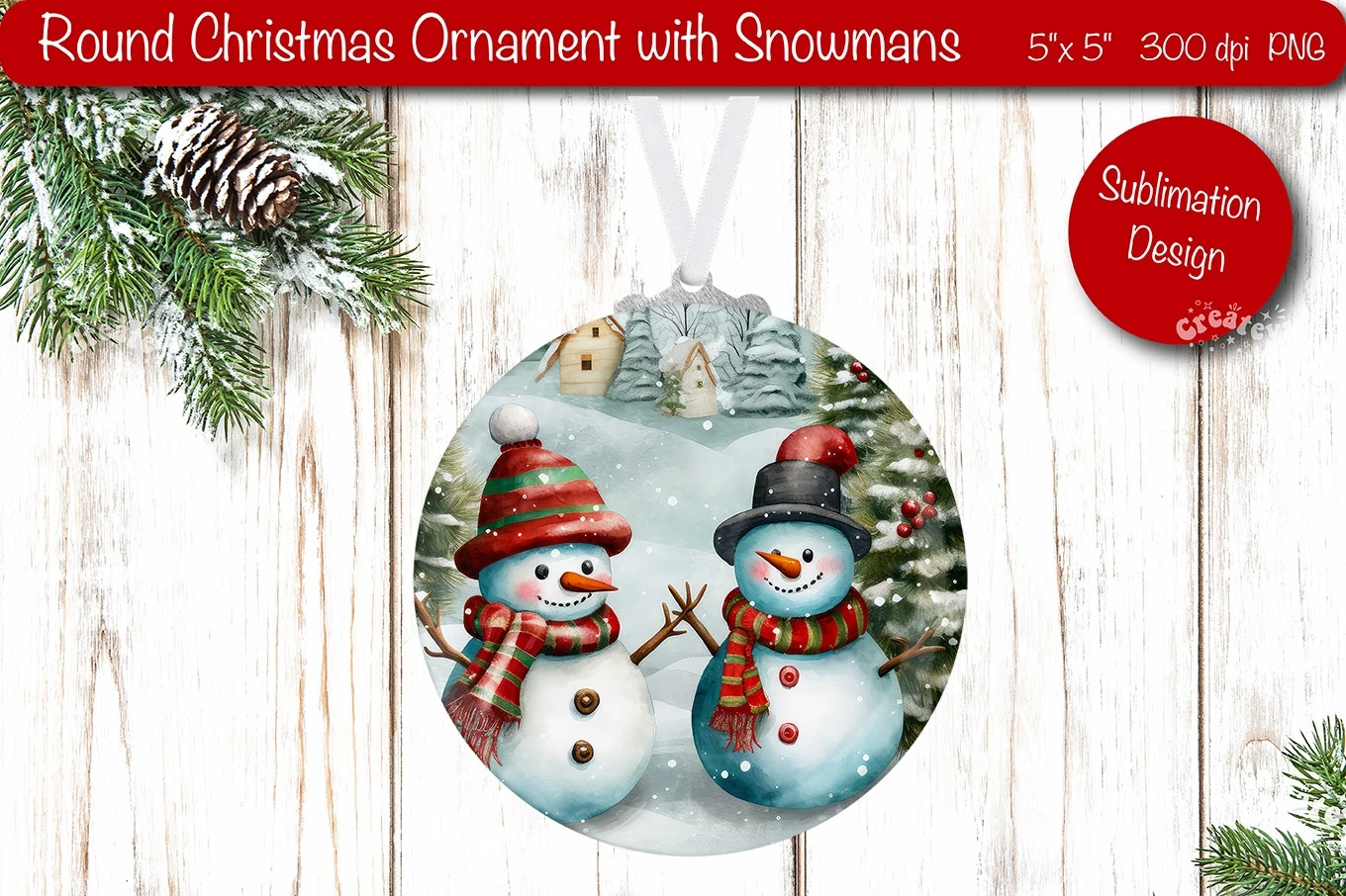 Round Christmas ornament sublimation with a cute Watercolor Snowman PNG. Cute Christmas Sublimation Round Ornament! Adorable snowmen, vibrant colors, and lasting memories. Perfect for your tree or as a delightful gift. Happy holidays!