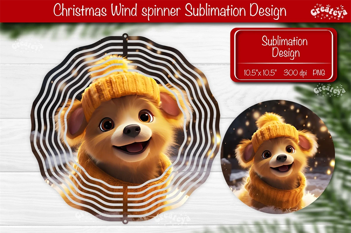 Round Christmas Wind Spinner with Cute Christmas Puppy PNG. These Christmas designs of wind spinner bring a touch of snow-filled charm and a warm, fuzzy feeling to your home decor.