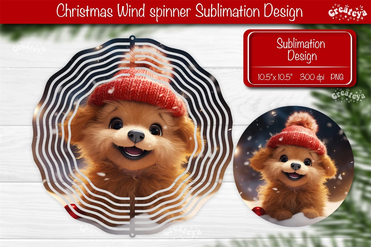 Round Christmas Wind Spinner with Cute Christmas Puppy PNG. These Christmas designs of wind spinner bring a touch of snow-filled charm and a warm, fuzzy feeling to your home decor.