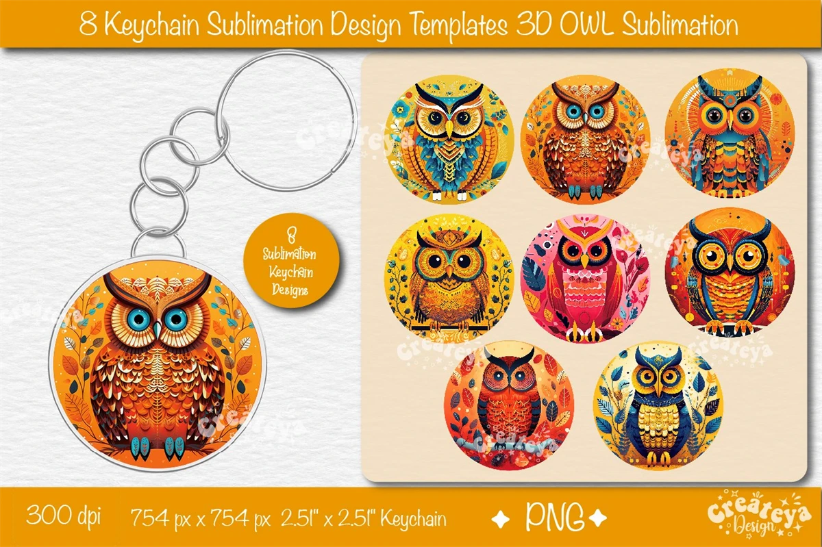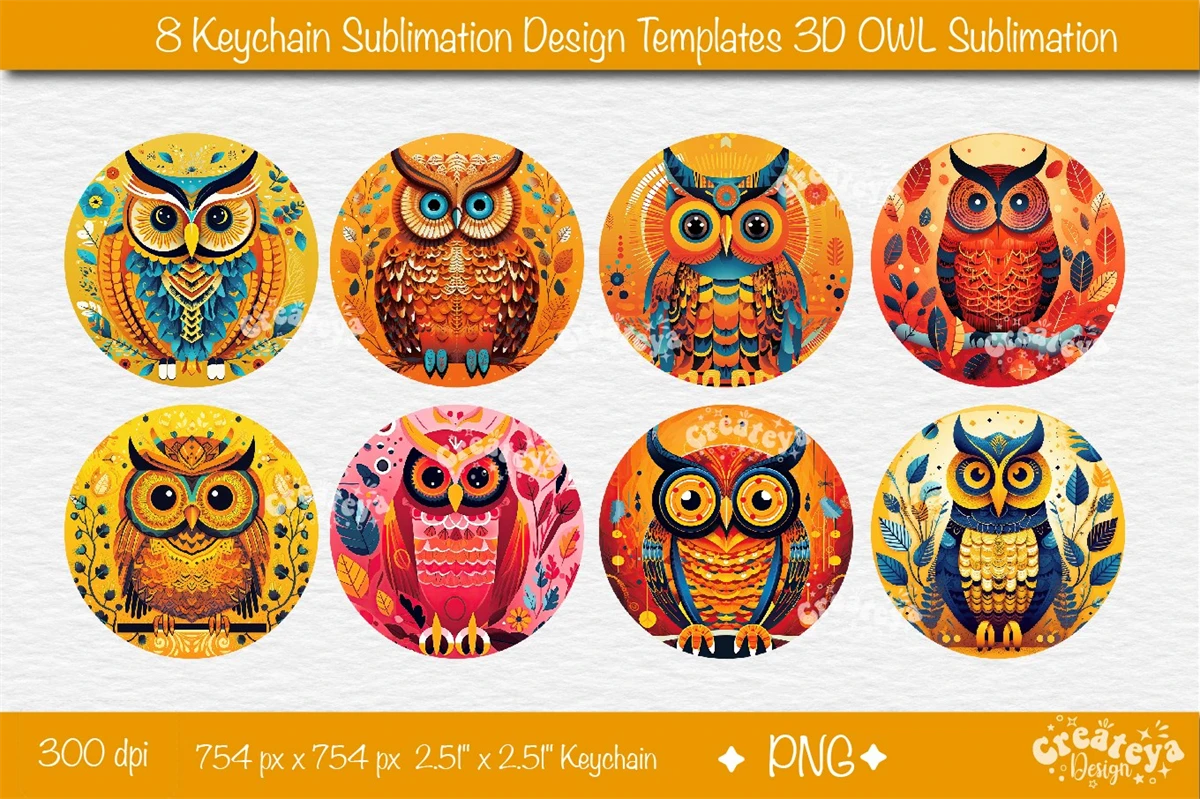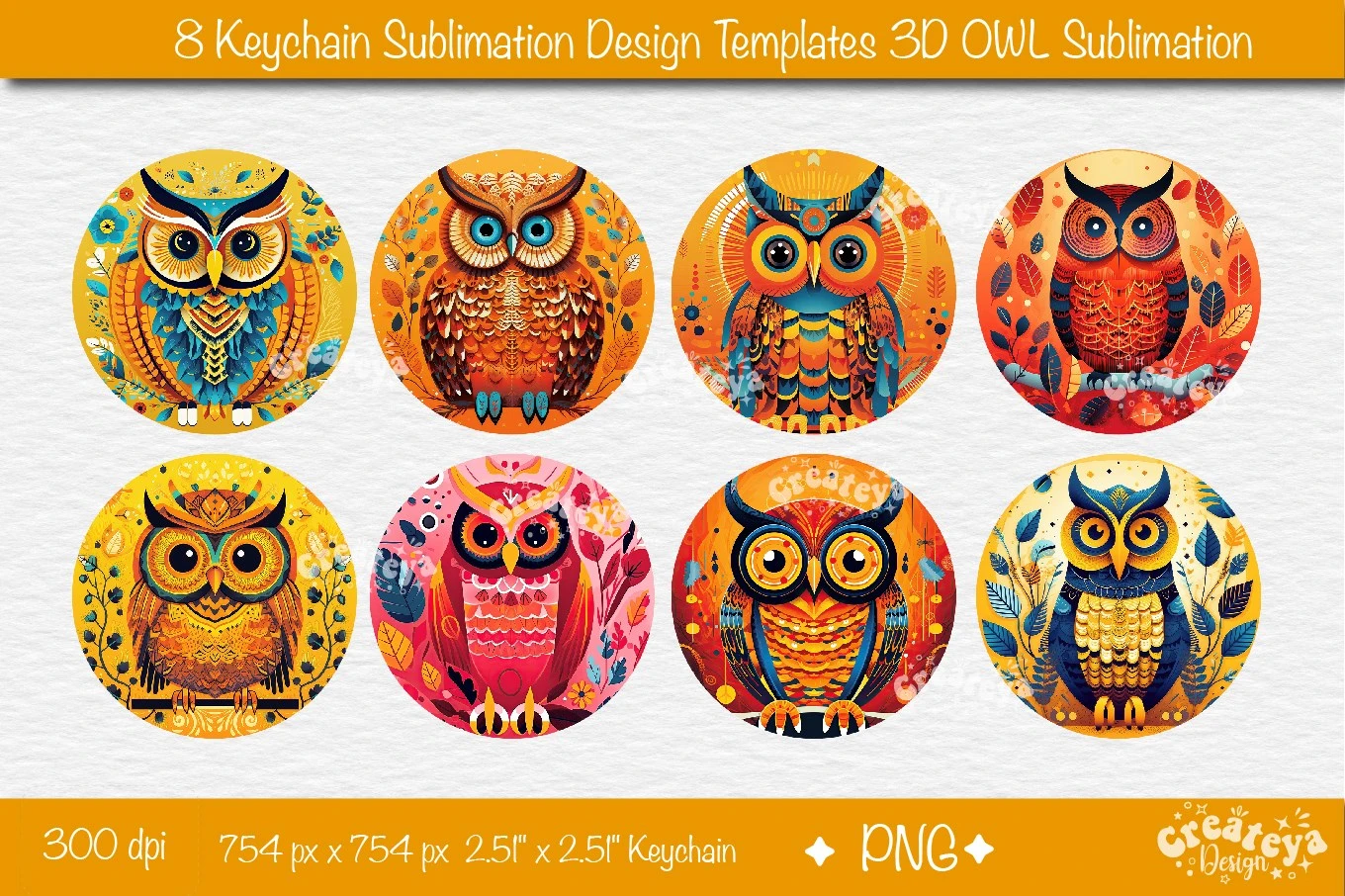 Round Keychain Sublimation Bundle PNG with bright 3D Owl PNG template. This sublimation bundle contains 8 designs.
