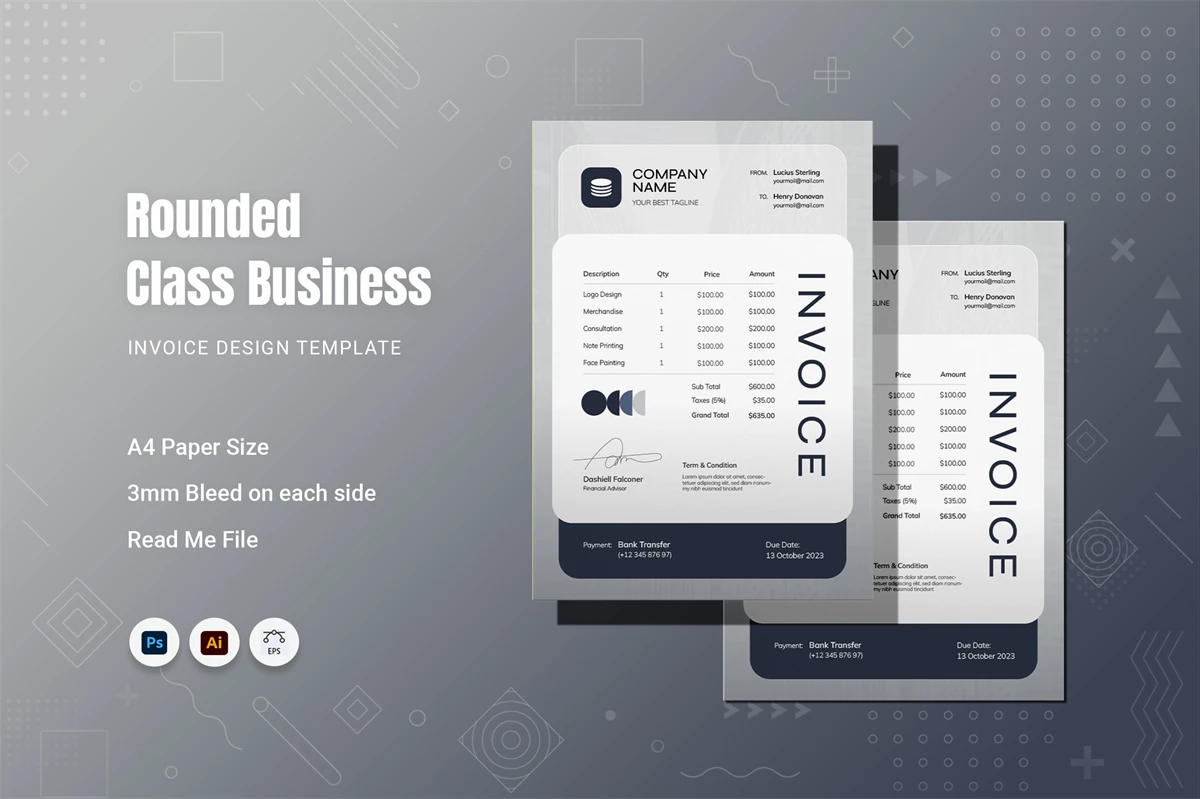 Each and every aspect holds significance within the realm of corporate affairs. Our invoice design template is poised to professionally showcase your brand. Your invoices will exude both style and practicality.