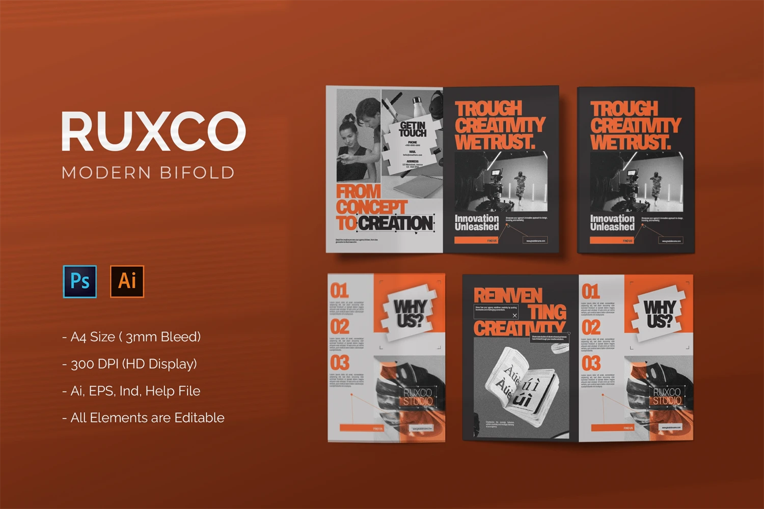 This bifold brochure design template offers a visually engaging canvas to showcase your message, products, or services. With a well-organized layout and attention-grabbing graphics, each panel tells a part of your story.