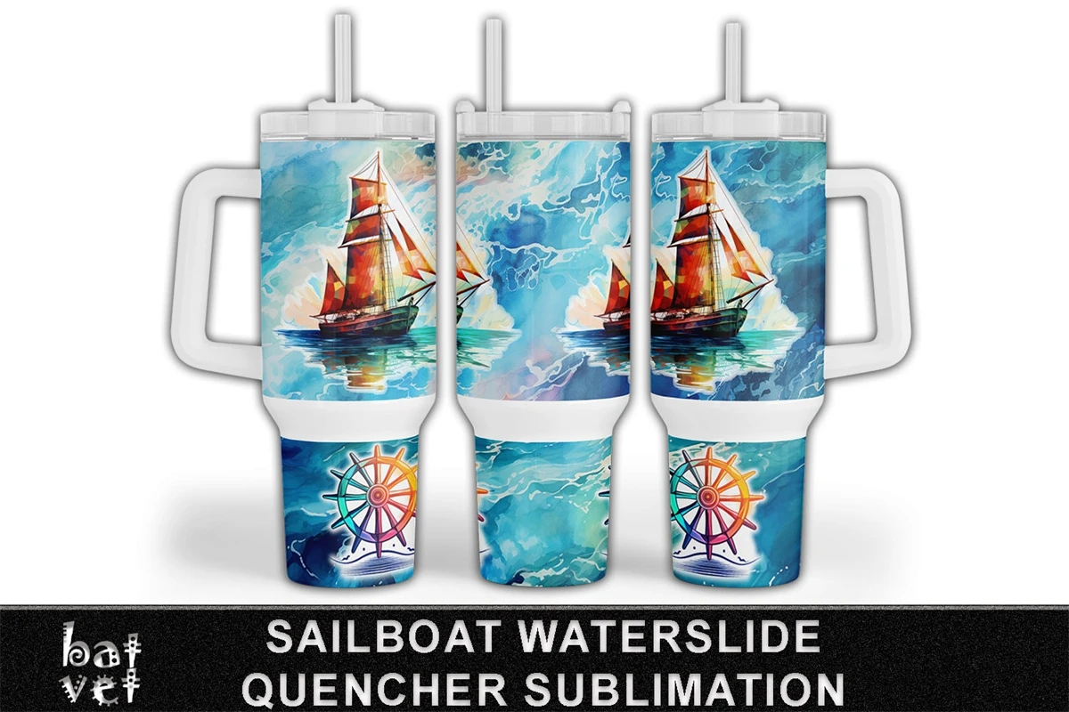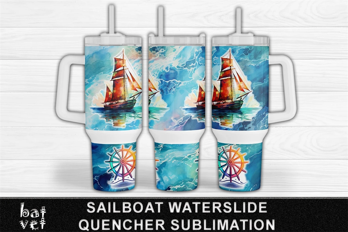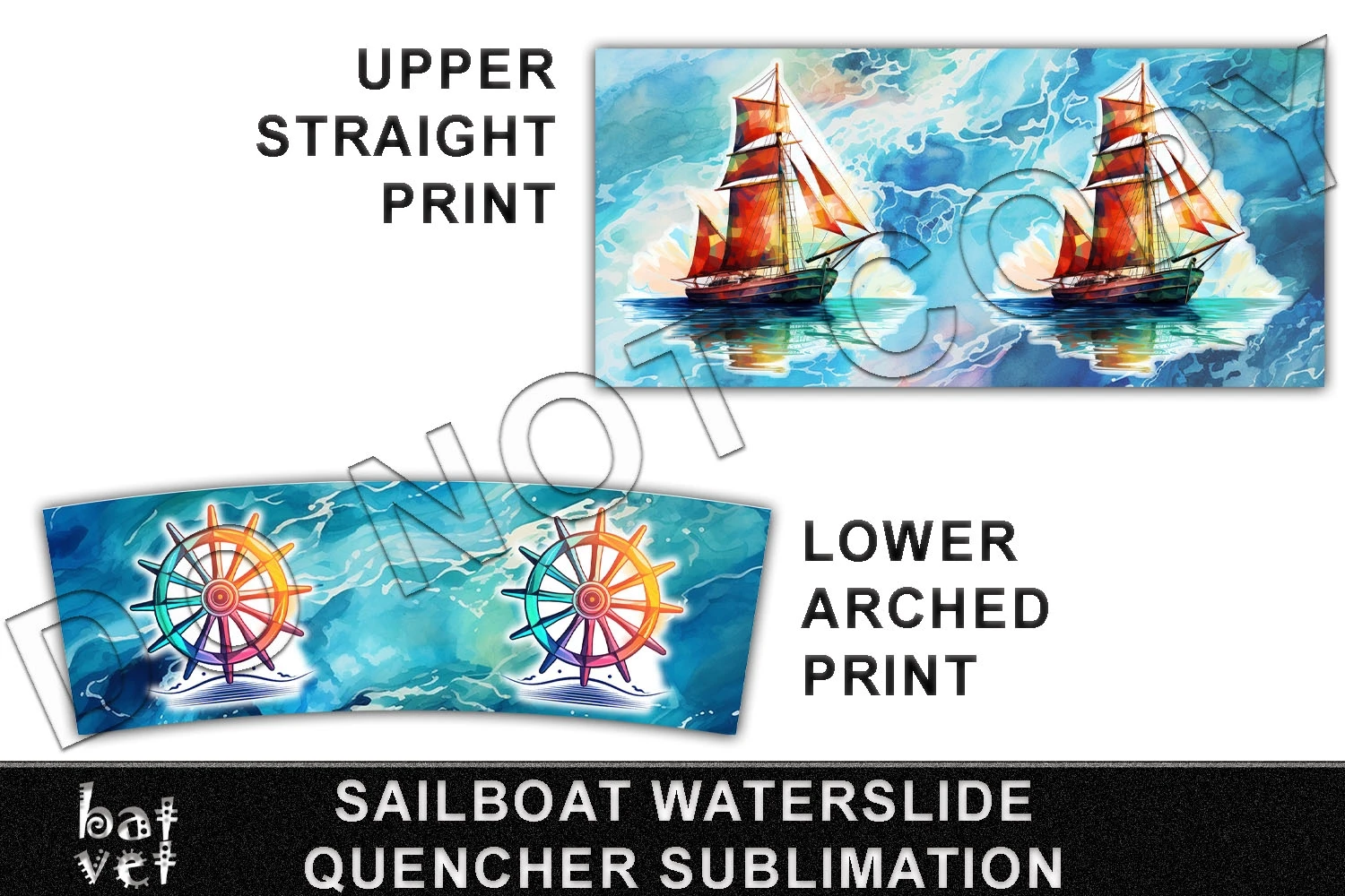Ocean Tumbler 40 Oz Quencher Waterslide Sailboat Sublimation Wrap. Two Part Sublimation - Upper Straight and Lower Arched Print.