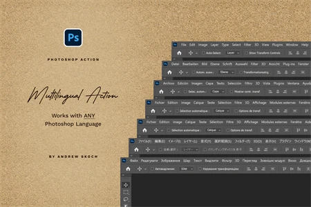 Action works with any interface language. Also , you can play action many times in the same PSD. Just choose needed layer or layer group and play action.