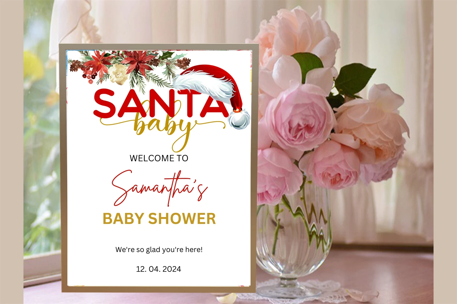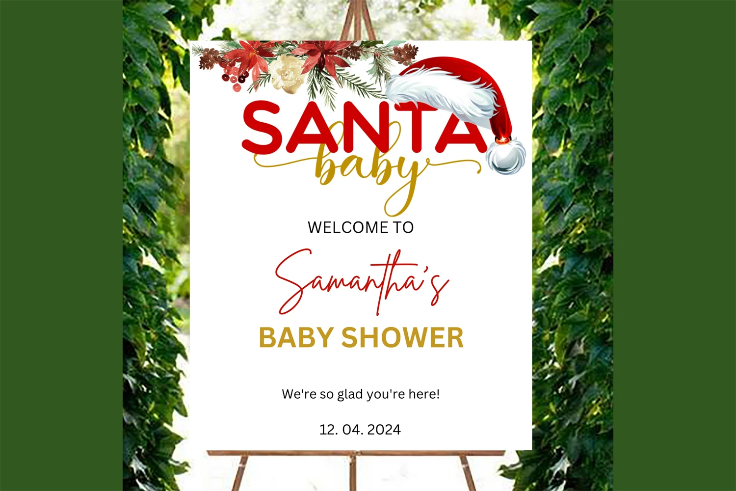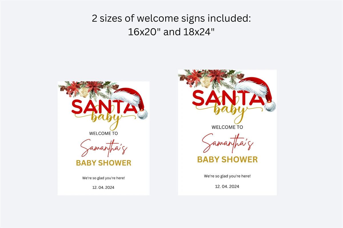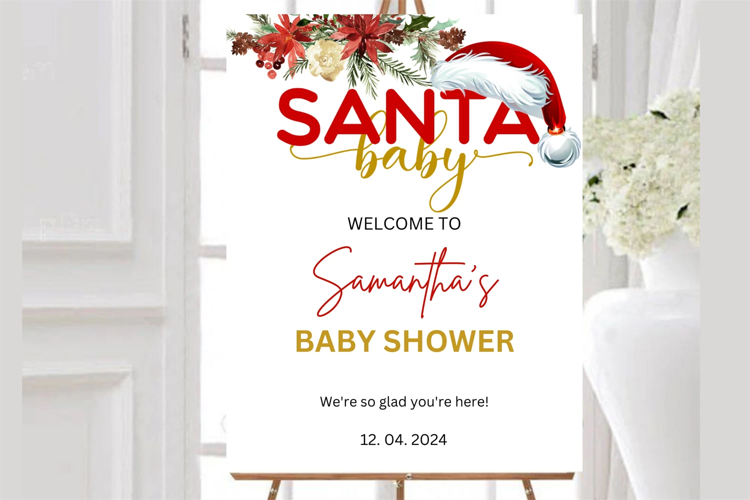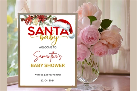 Warmly welcome your guests to a festive celebration with our adorable "Santa Baby Baby Shower Welcome Sign." This delightful sign features whimsical holiday graphics and a playful design, perfectly blending the cute charm of a baby shower with the magic of the Christmas season. Ideal for hanging at the entrance or displaying at your party, it sets a joyful tone for the festivities ahead. Celebrate the upcoming arrival of your little one with style and cheer!