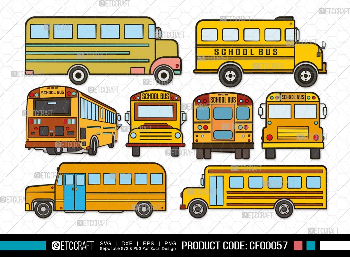 Hop on the creativity bus and enjoy the ride with our "School Bus Clipart Back & Front Side" SVG cut file bundle. Let the school days' memories inspire your crafting adventures!