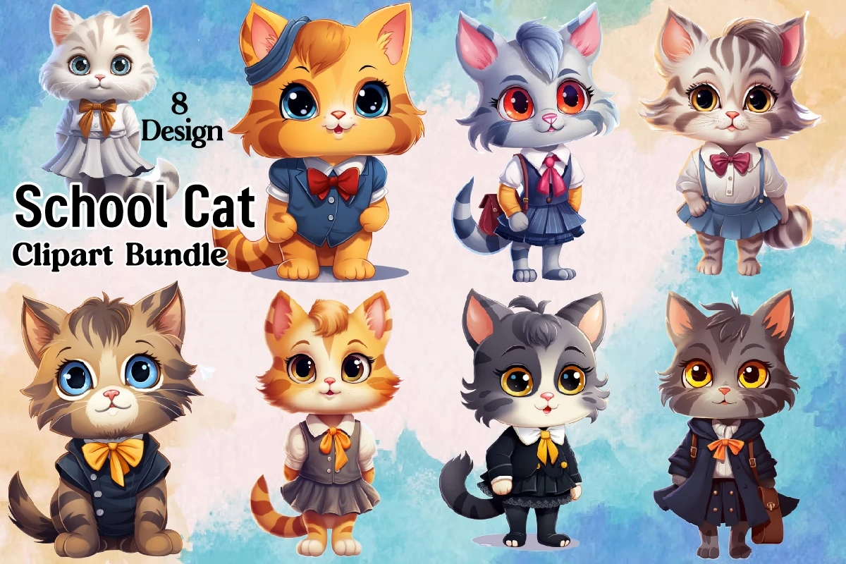 Watercolor School Cat Clipart PNG Bundle