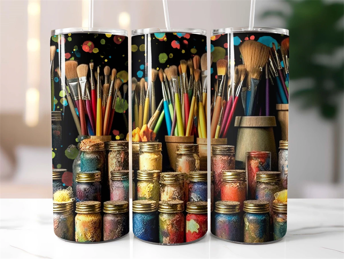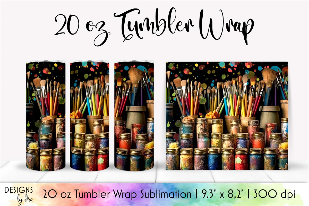 20 oz Tumbler wrap sublimation with coloured pencils, paint brushes, paper clips, sticky notes (stationary)