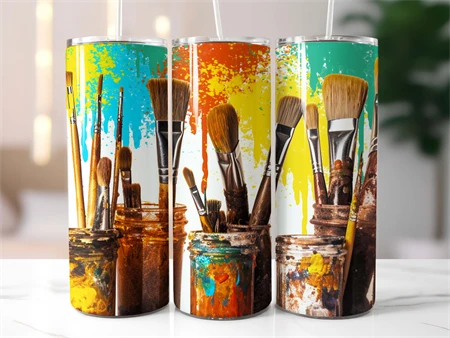 20 oz Tumbler wrap sublimation with coloured pencils, paint brushes, paper clips, sticky notes (stationary)