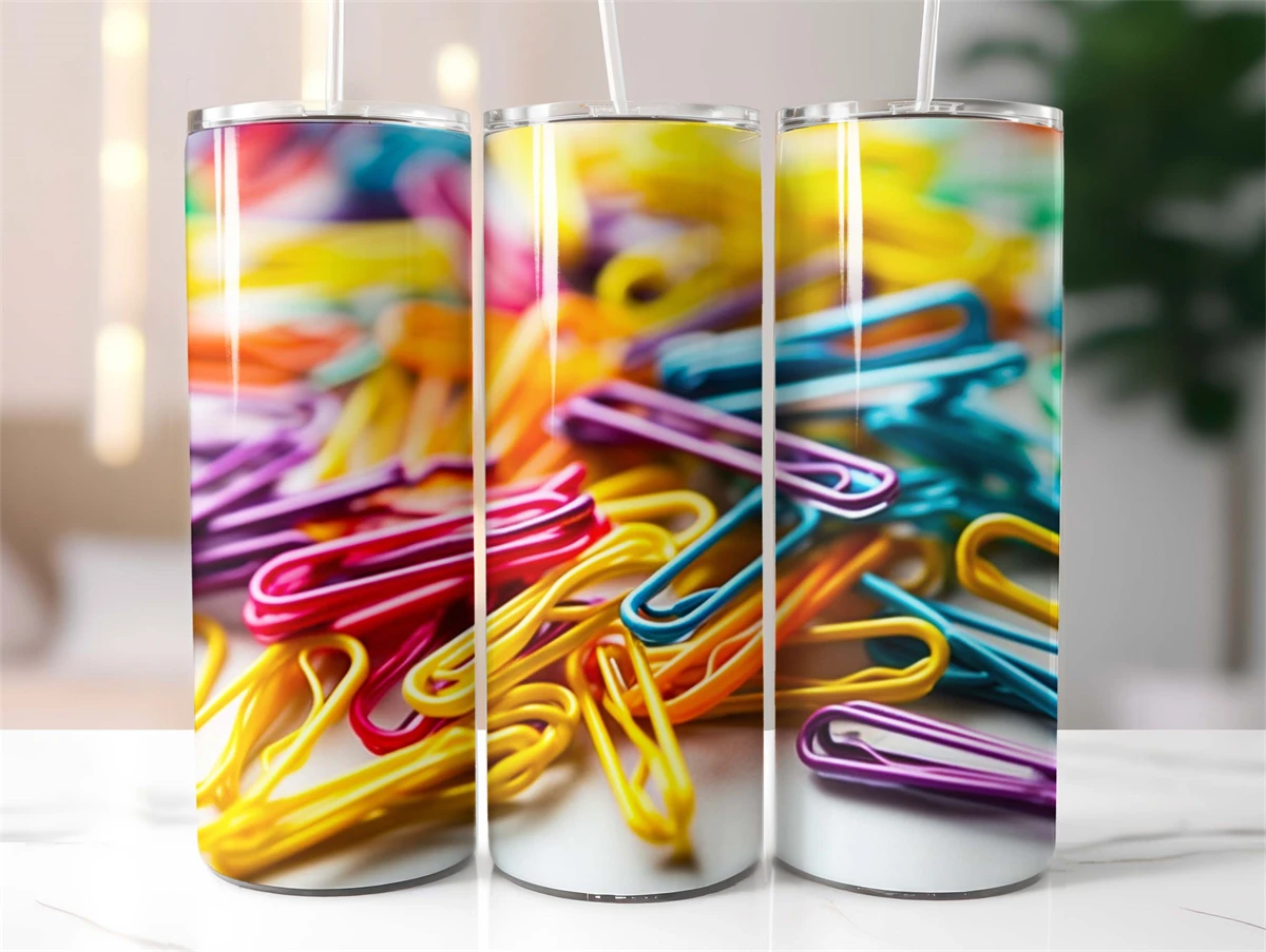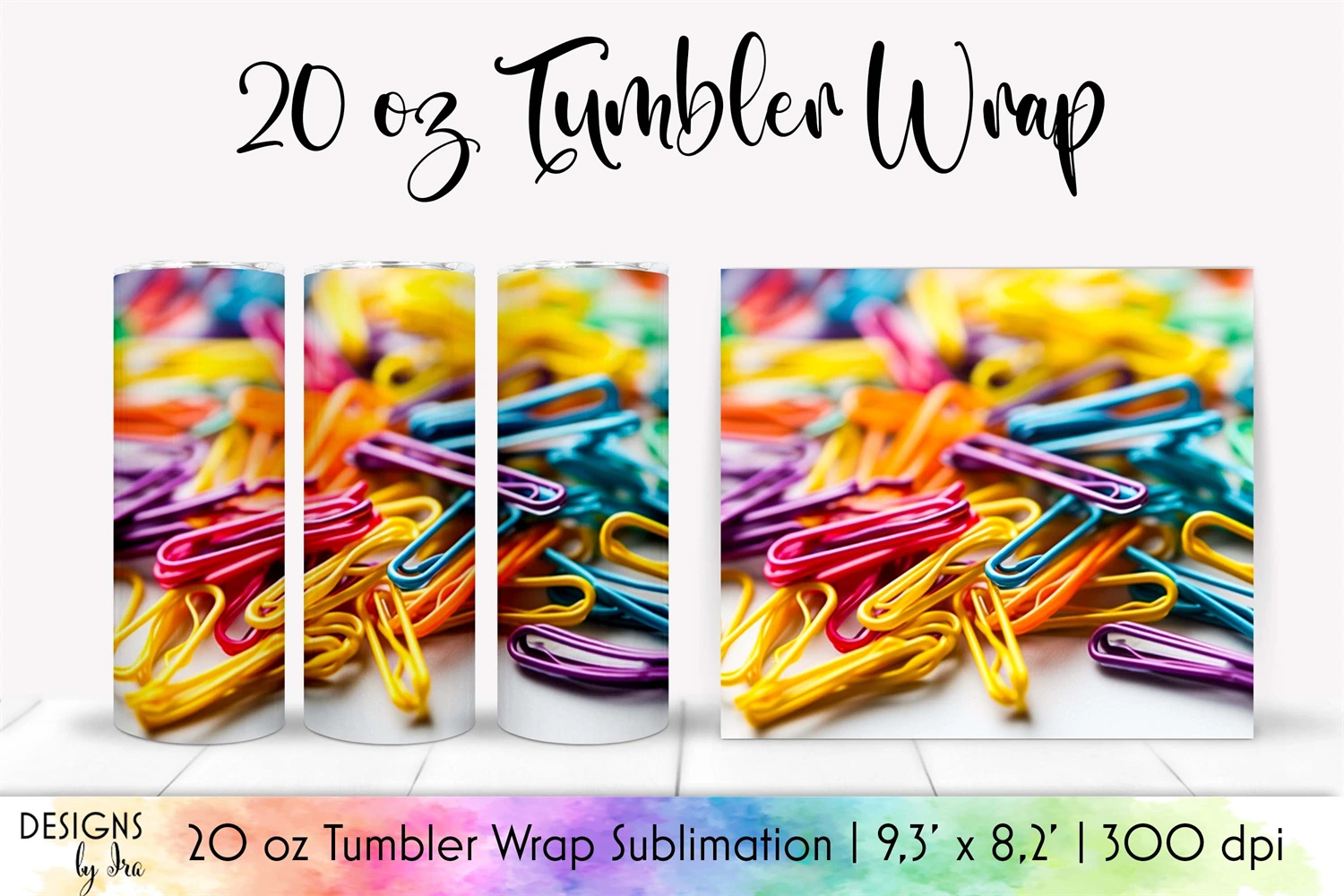 20 oz Tumbler wrap sublimation with coloured pencils, paint brushes, paper clips, sticky notes (stationary)