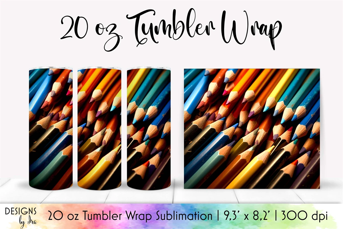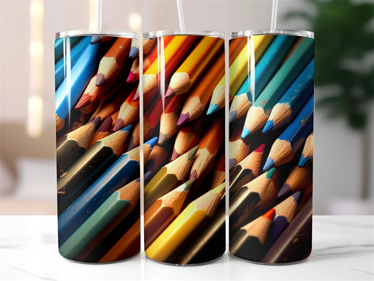 20 oz Tumbler wrap sublimation with coloured pencils, paint brushes, paper clips, sticky notes (stationary)