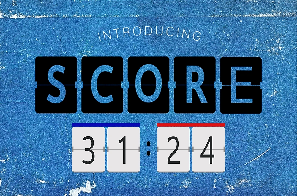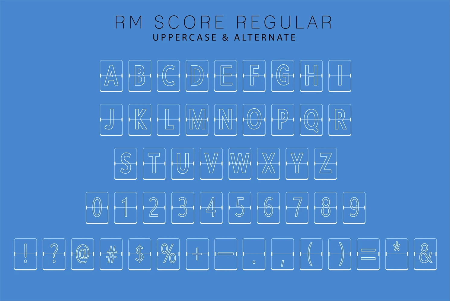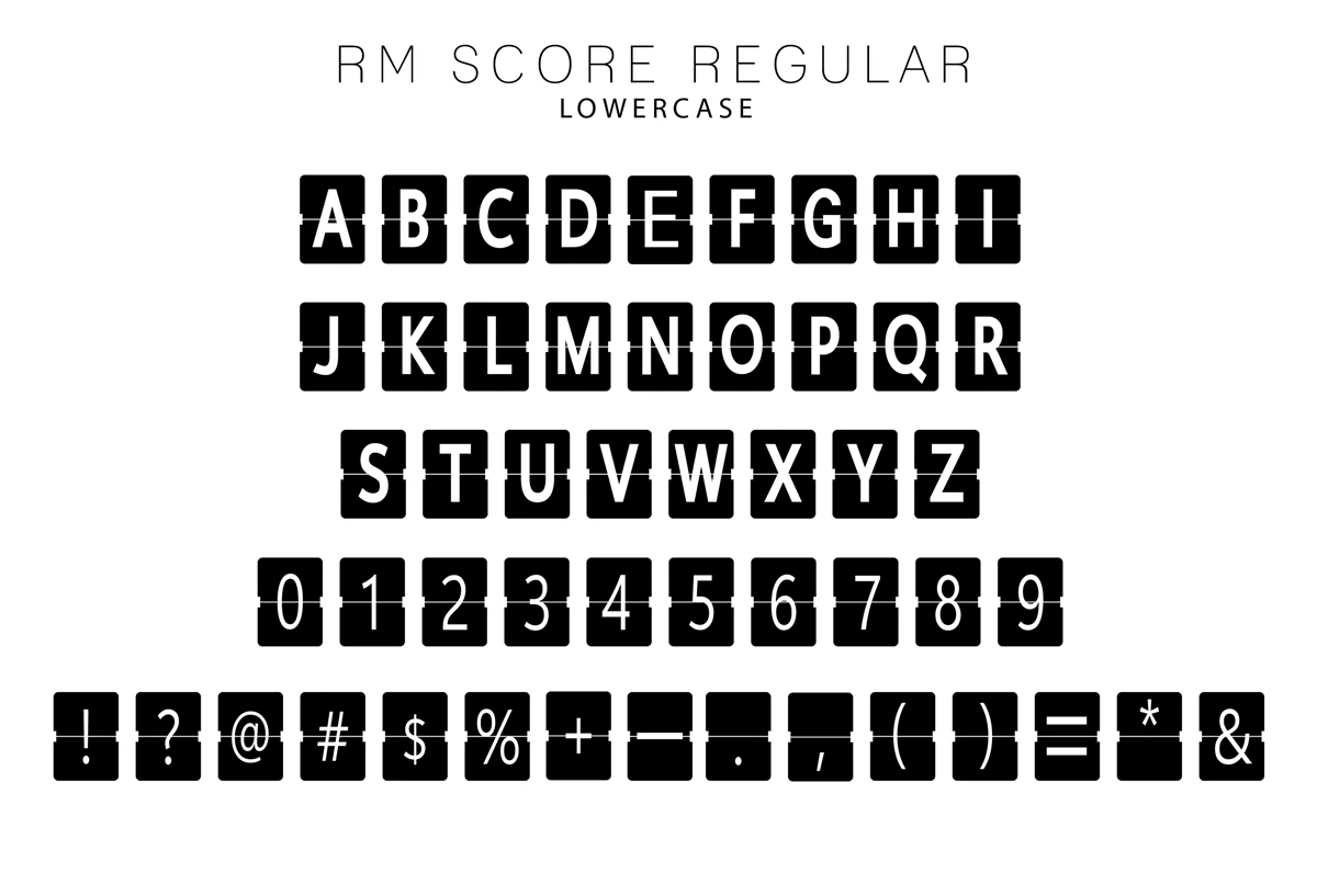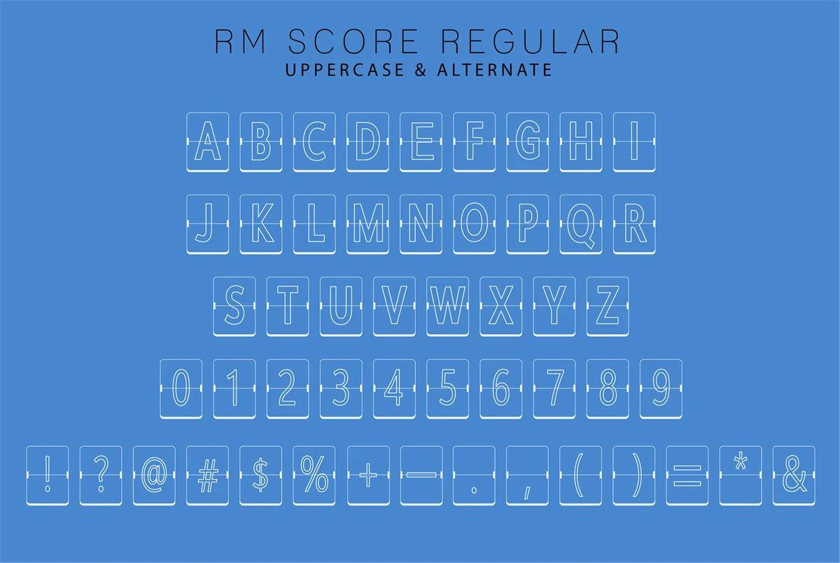 Experience the dynamic movement of sporting events directly in your creative projects with Score Font. This comprehensive typeface offers an authentic replication of flipboard style, traditionally found in sports scoreboards. With remarkable versatility, Score Font extends beyond its sports theme, effortlessly adapting to applications like calendar designs and digital clocks. Its user-friendly nature ensures that invoking this engaging, flipboard style is as easy as typing your next sentence.