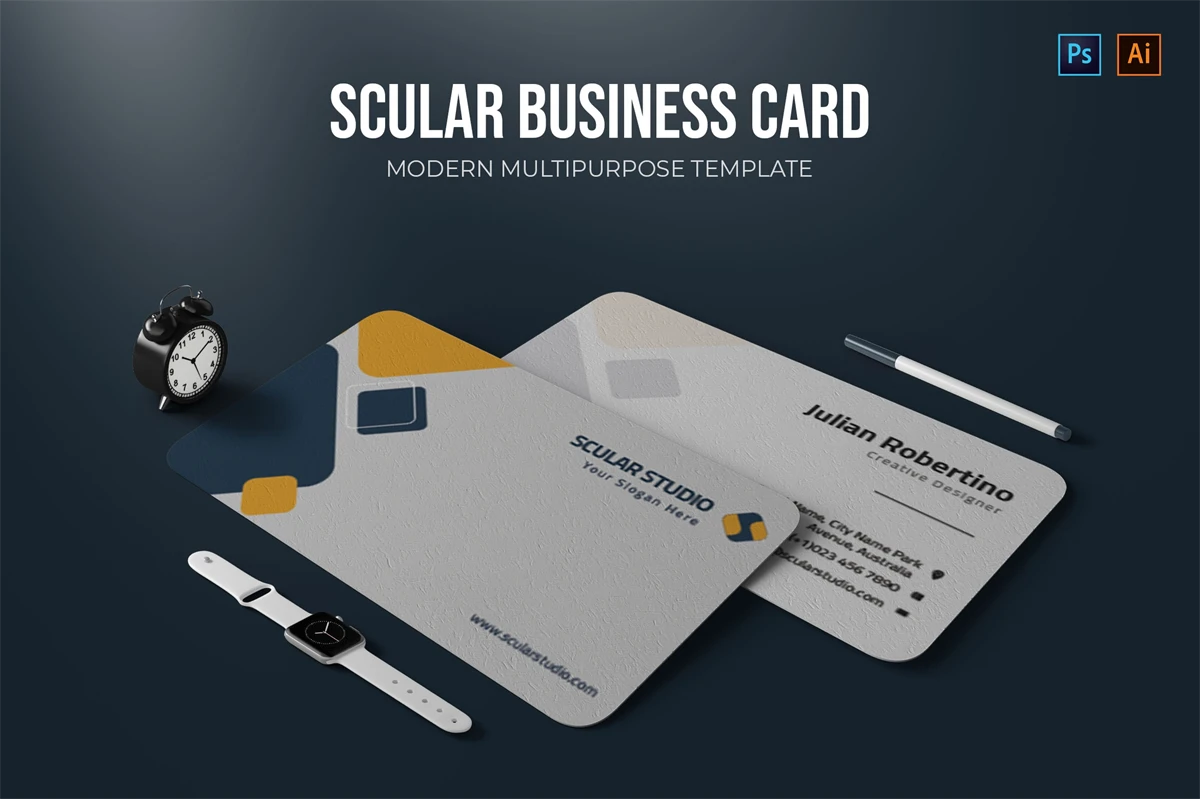 This Scular Studio - Business Card make your business cards look professional. You can use this business card for, identity, company business cards, Corporate Business, Creative, Blogs, Photographers, Artists, Designers, etc.