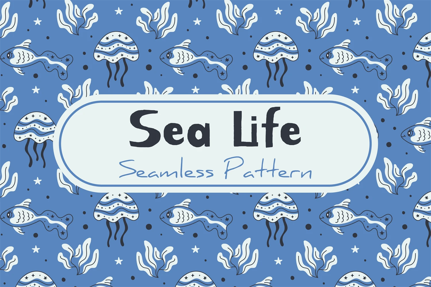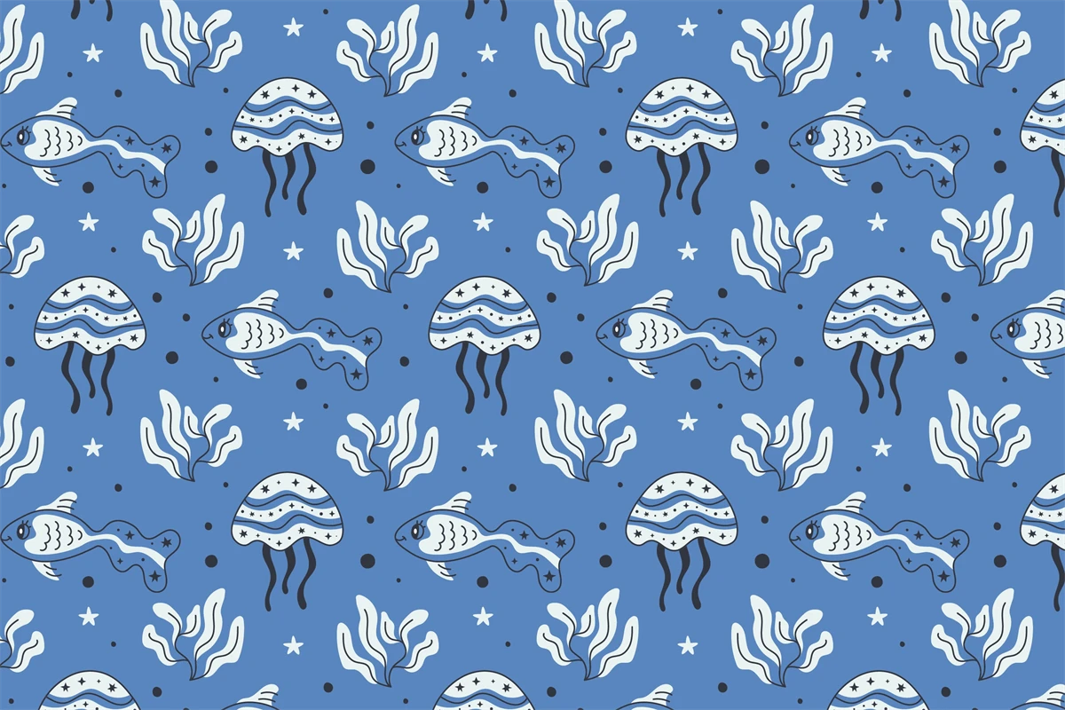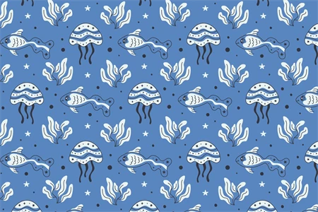 Marine and Ocean seamless pattern with fish, seaweed, jellyfish, starfish and bubbles on blue background. Sea life aquatic endless background. Underwater digital paper in cartoon doodle style. Perfect for kids, scrapbooking, decoupage, wrapping paper, wallpaper, fabric, textile, junkbooking, bathroom, interior design. Repeat vector illustration.