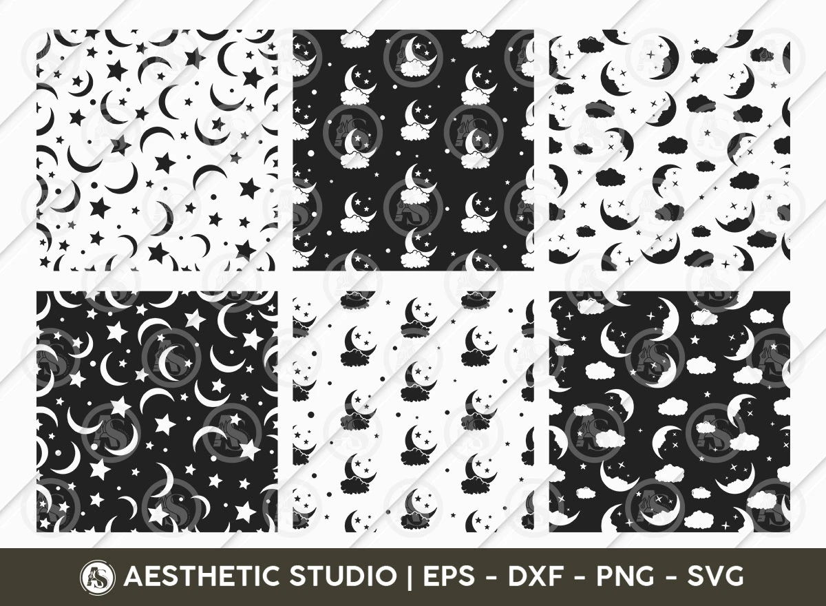 Diverse Moon Patterns: Our bundle includes a captivating range of seamless moon patterns, each capturing the enchanting allure of the moon in various phases and settings. From crescent moons to full moons, you'll find patterns that suit your every creative need.