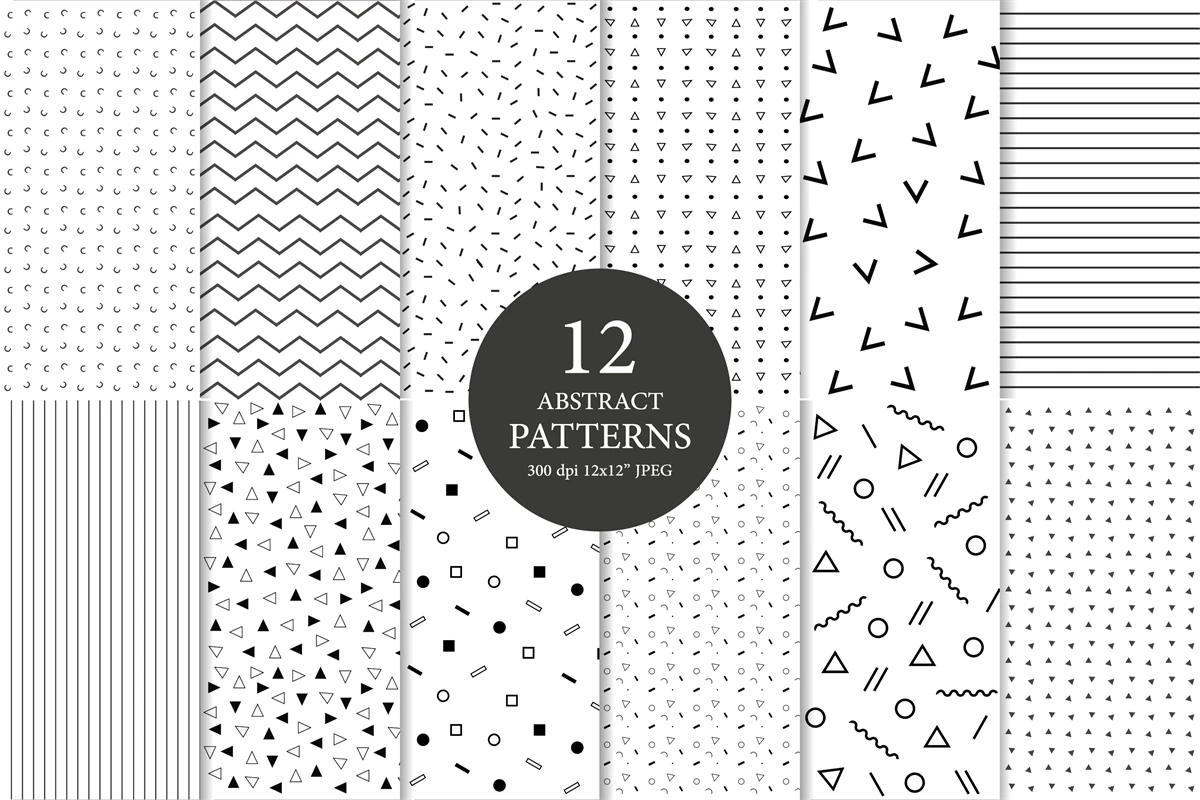 Seamless patterns, Abstract geometric shapes, Black & white textures, Digital paper set, 12 JPEG 300dpi 12x12 inches