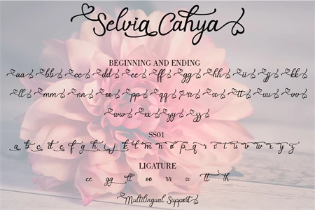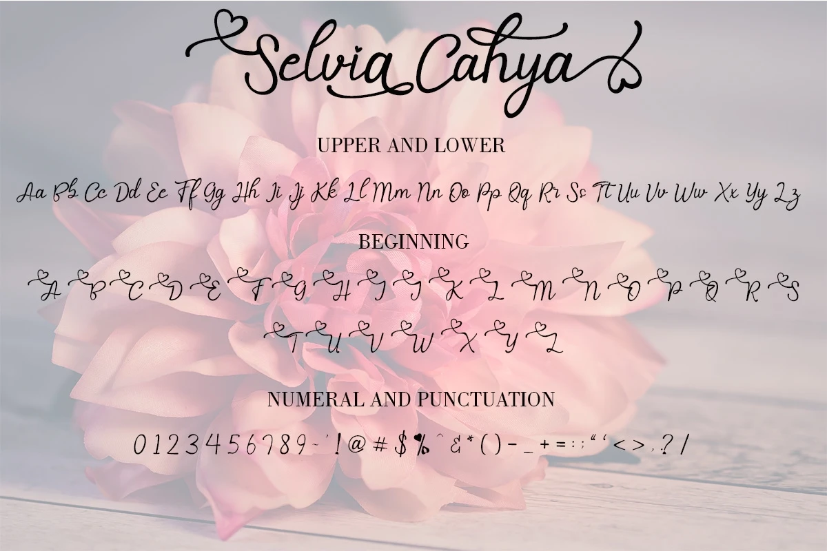 Selvia Cahya is a beautiful modern script font. Can be used for a variety of projects, such as creating wedding invitations or beautiful child birth invitations, beautiful artwork, interesting social media posts, and funny greeting cards.