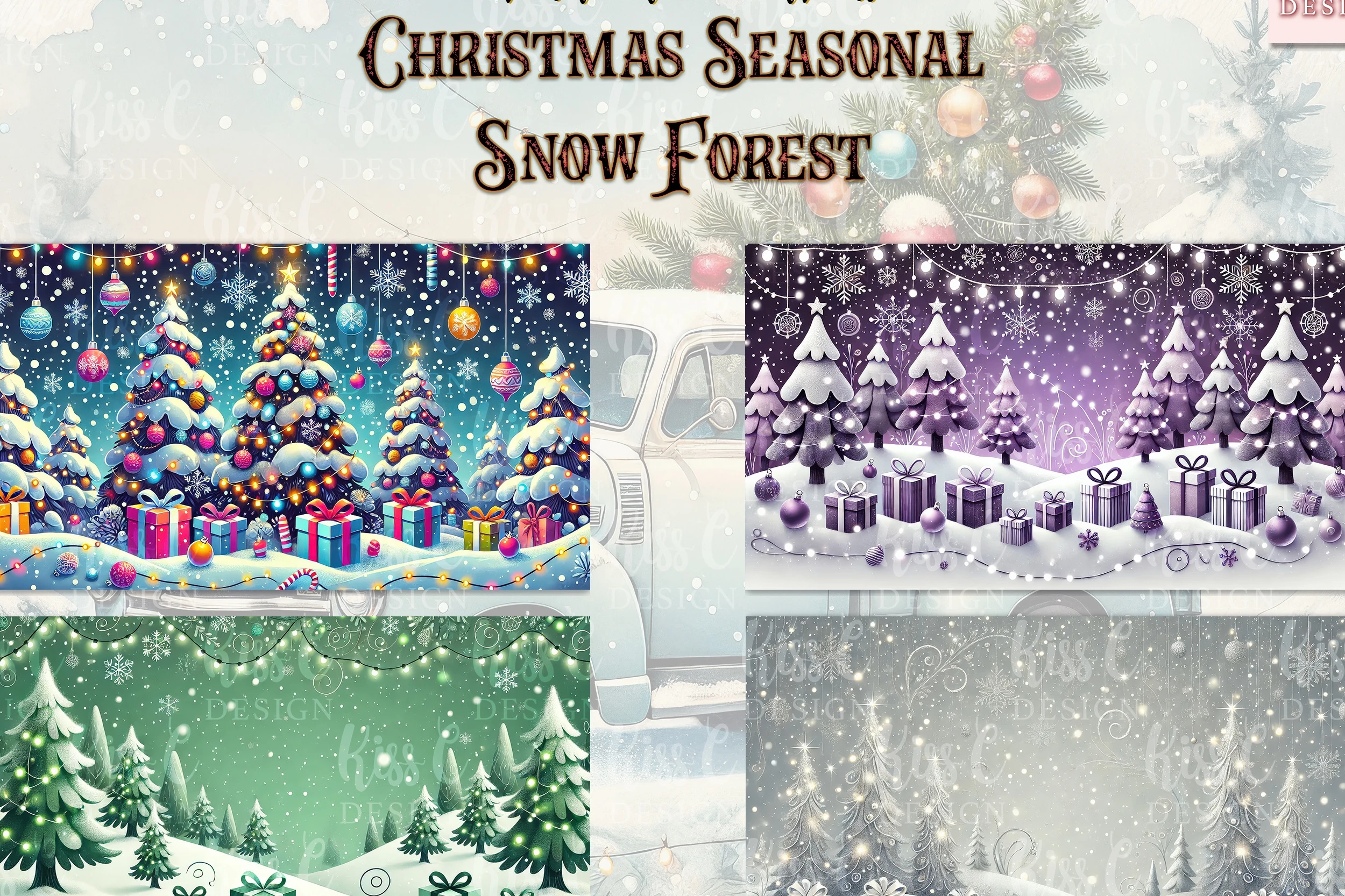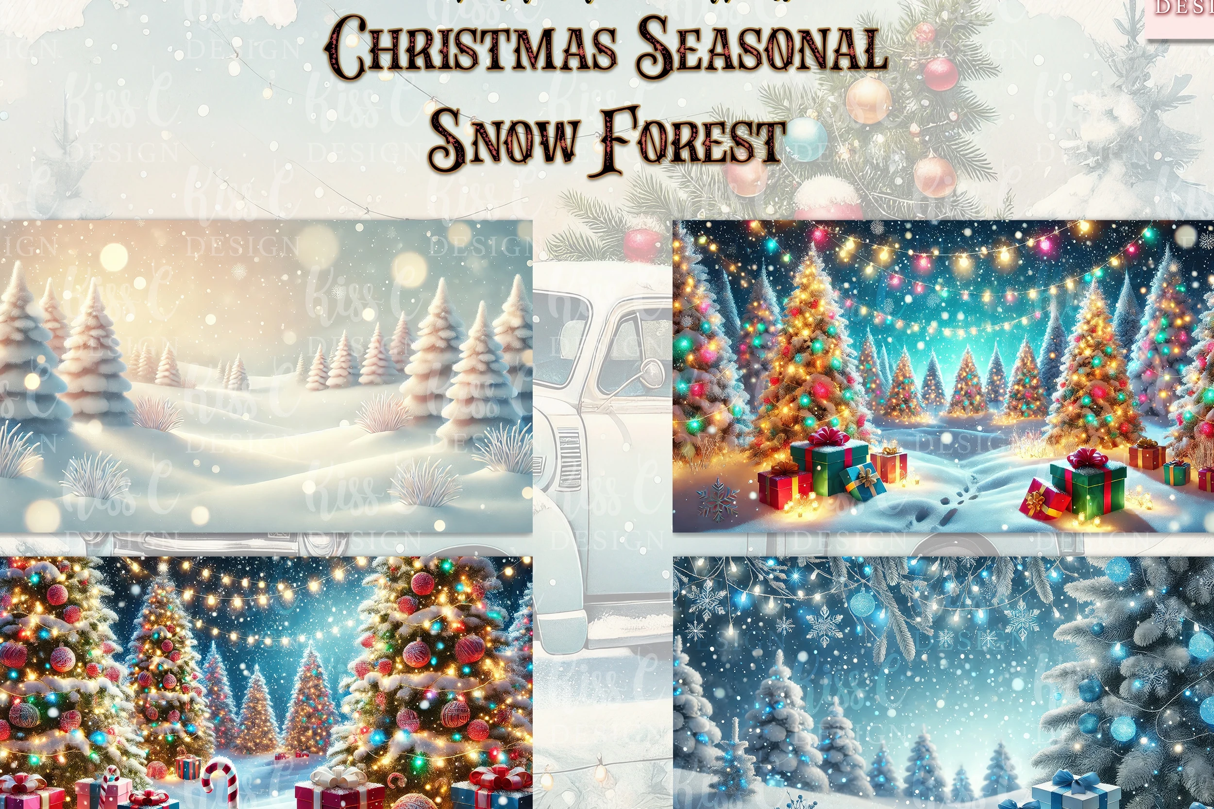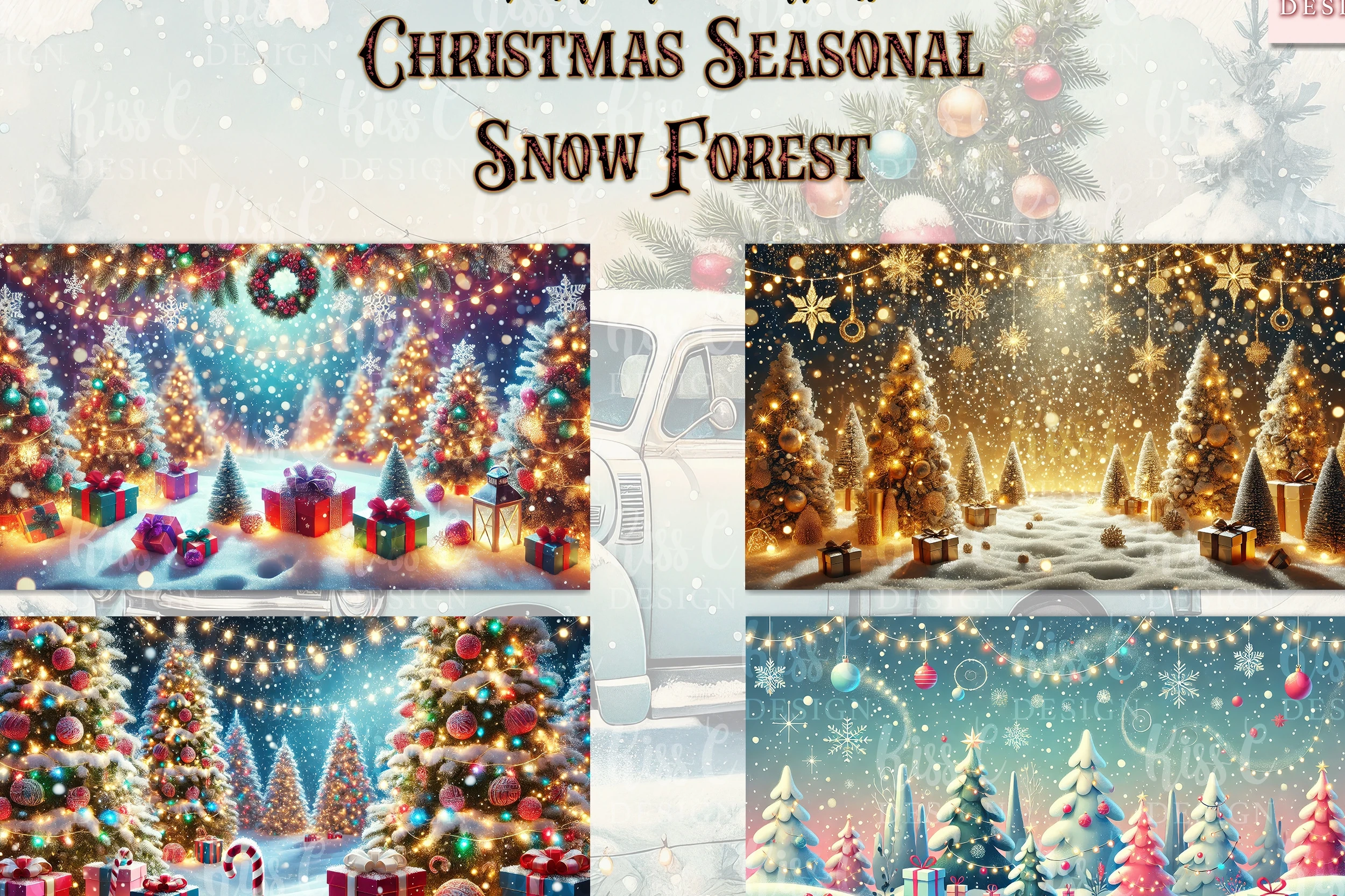 Showcasing snowy forests with twinkling lights, festive ornaments, and beautifully wrapped gifts, these scenes radiate holiday charm in vibrant and elegant styles.
