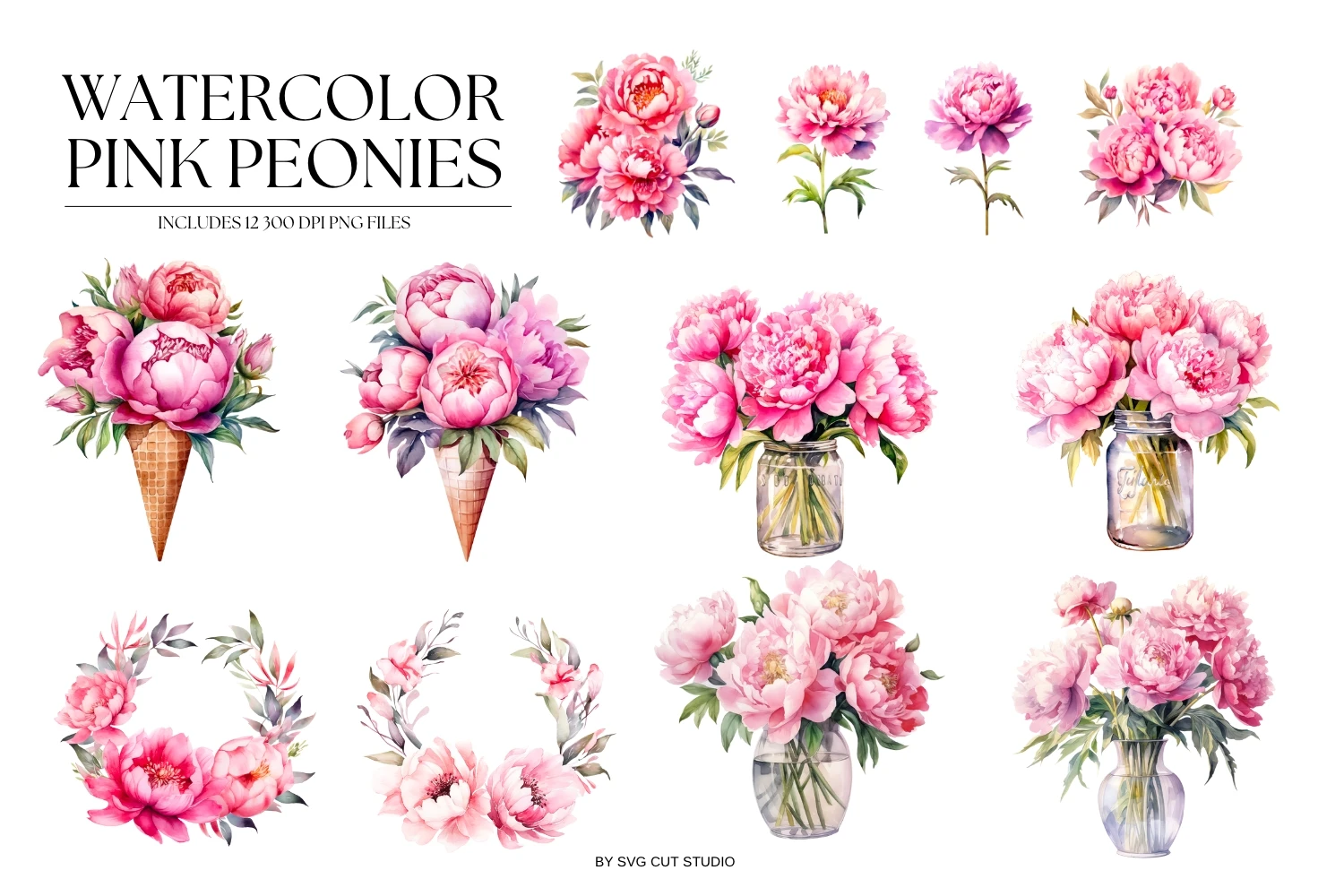 Set of 12 Watercolour Pink peonies PNG Clipart.