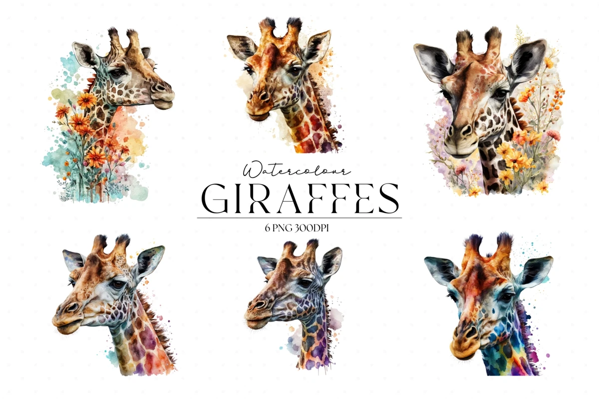 Set of Colourful Watercolour Giraffes Sublimation PNG.