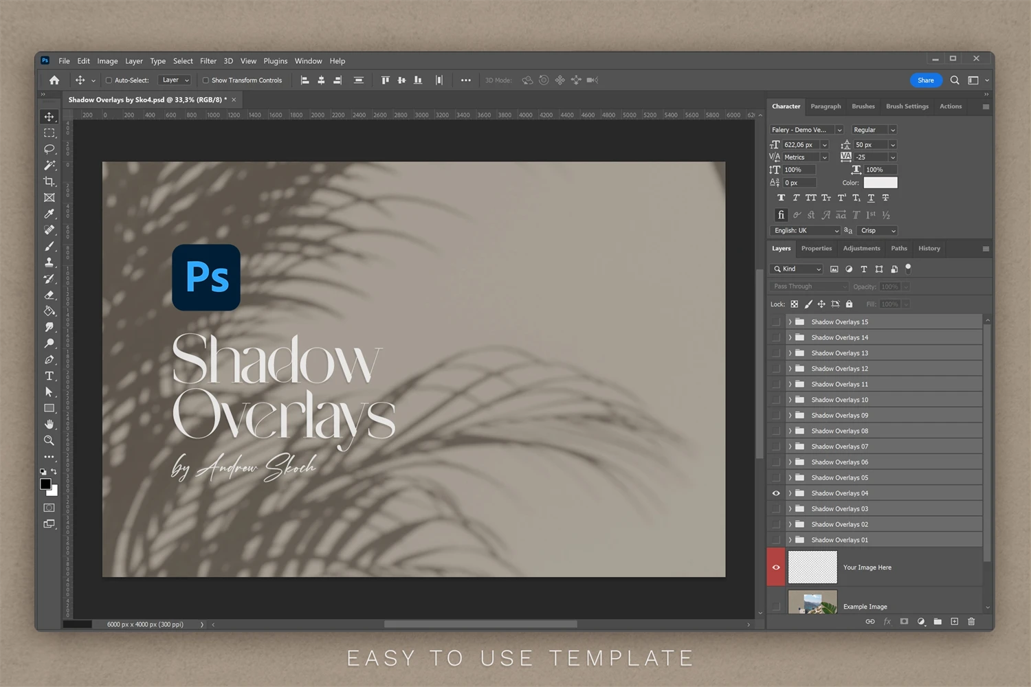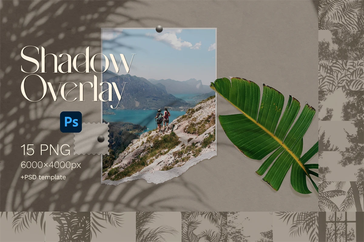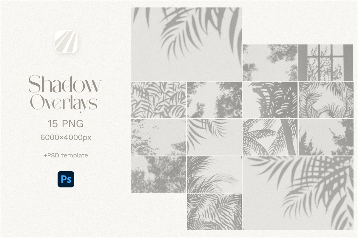 'Shadow Overlays' is a comprehensive collection featuring 15 high-quality PNG files and a PSD template. These overlays are perfect for adding natural shadows to your images, mimicking the play of light and shadow on walls, as well as the intricate patterns created by leaves and trees. Whether you're designing a brochure, creating a social media graphic, or enhancing a photograph, these overlays offer a simple yet effective way to add depth and realism. Each shadow overlay is carefully crafted to seamlessly integrate with your images, helping you achieve professional results with ease.
