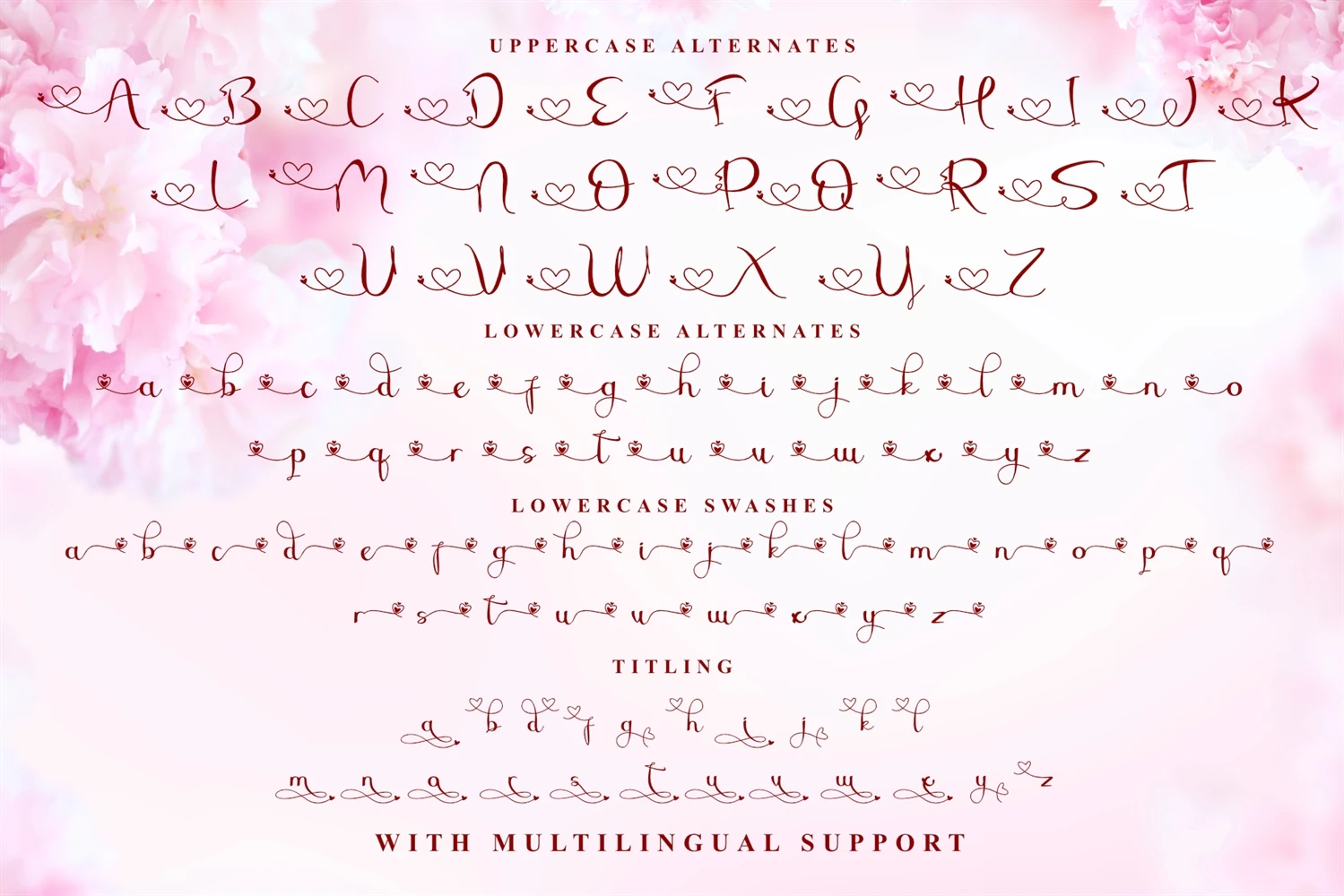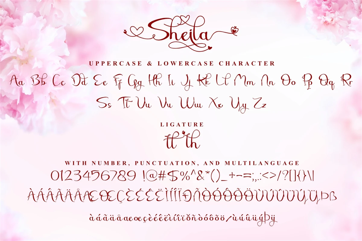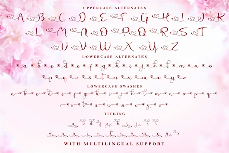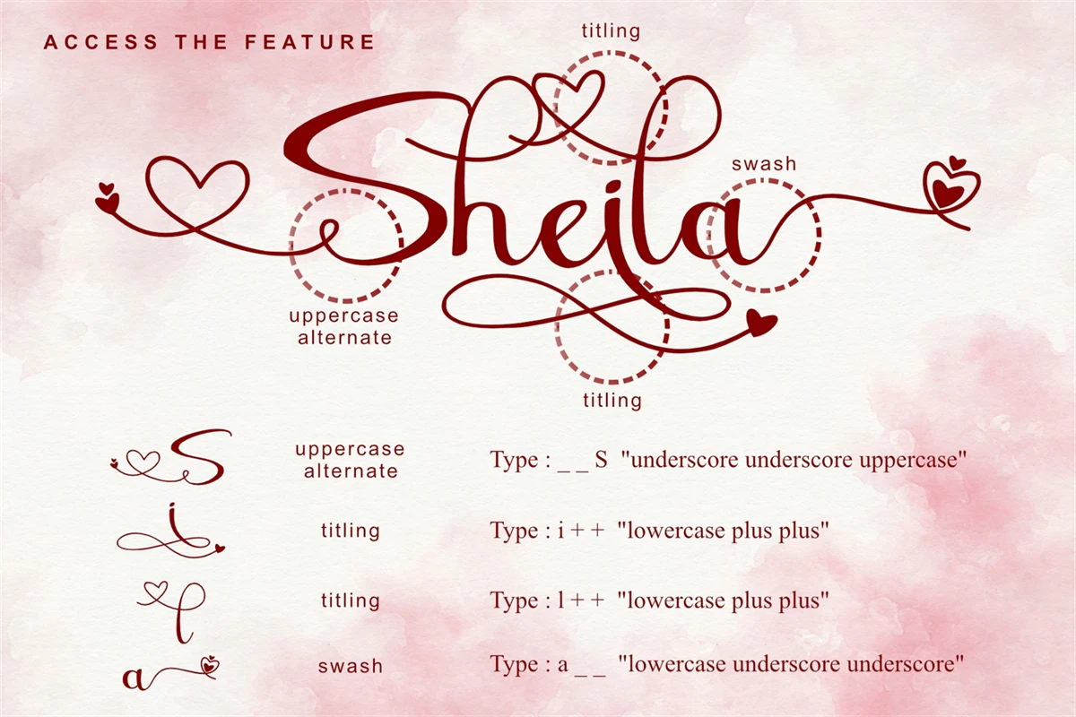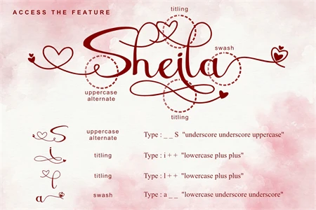 Sheila is a beautiful and romantic script font with multiple heart swashes to suit any of your valentines designs! This font is PUA encoded which means you can access all of the available glyphs and swashes with ease!