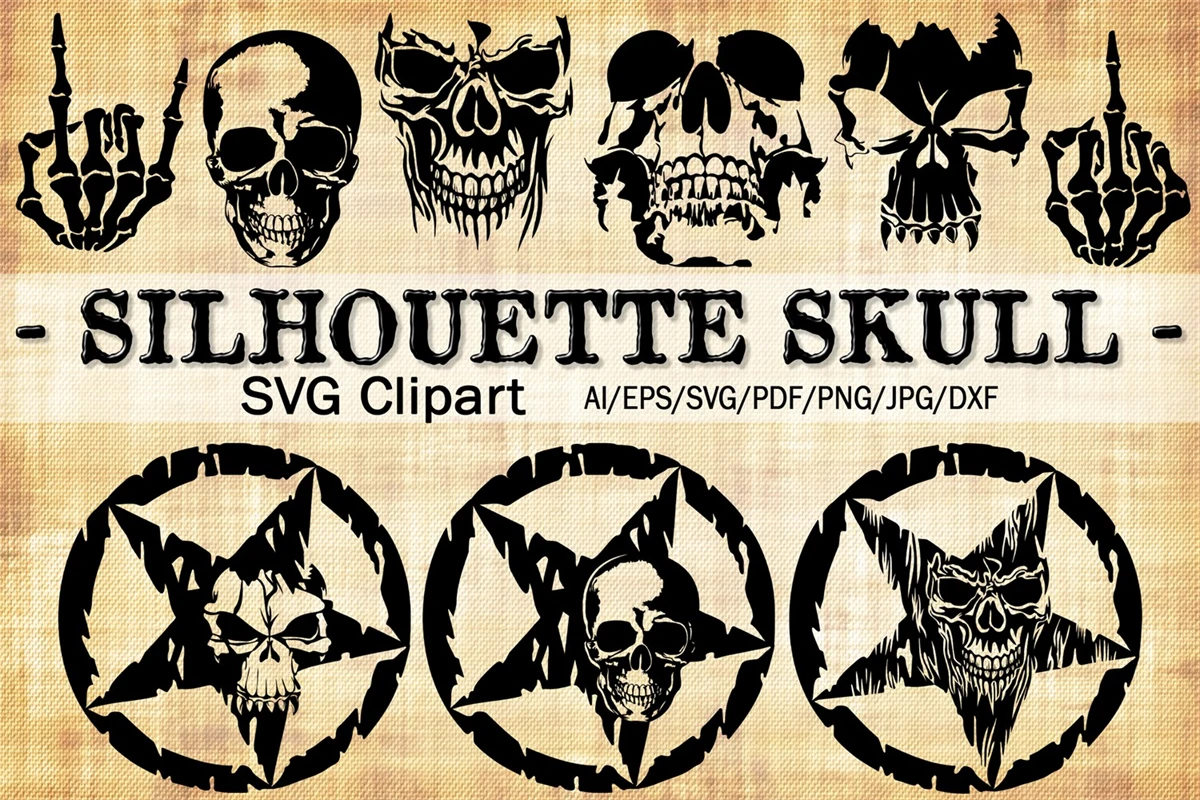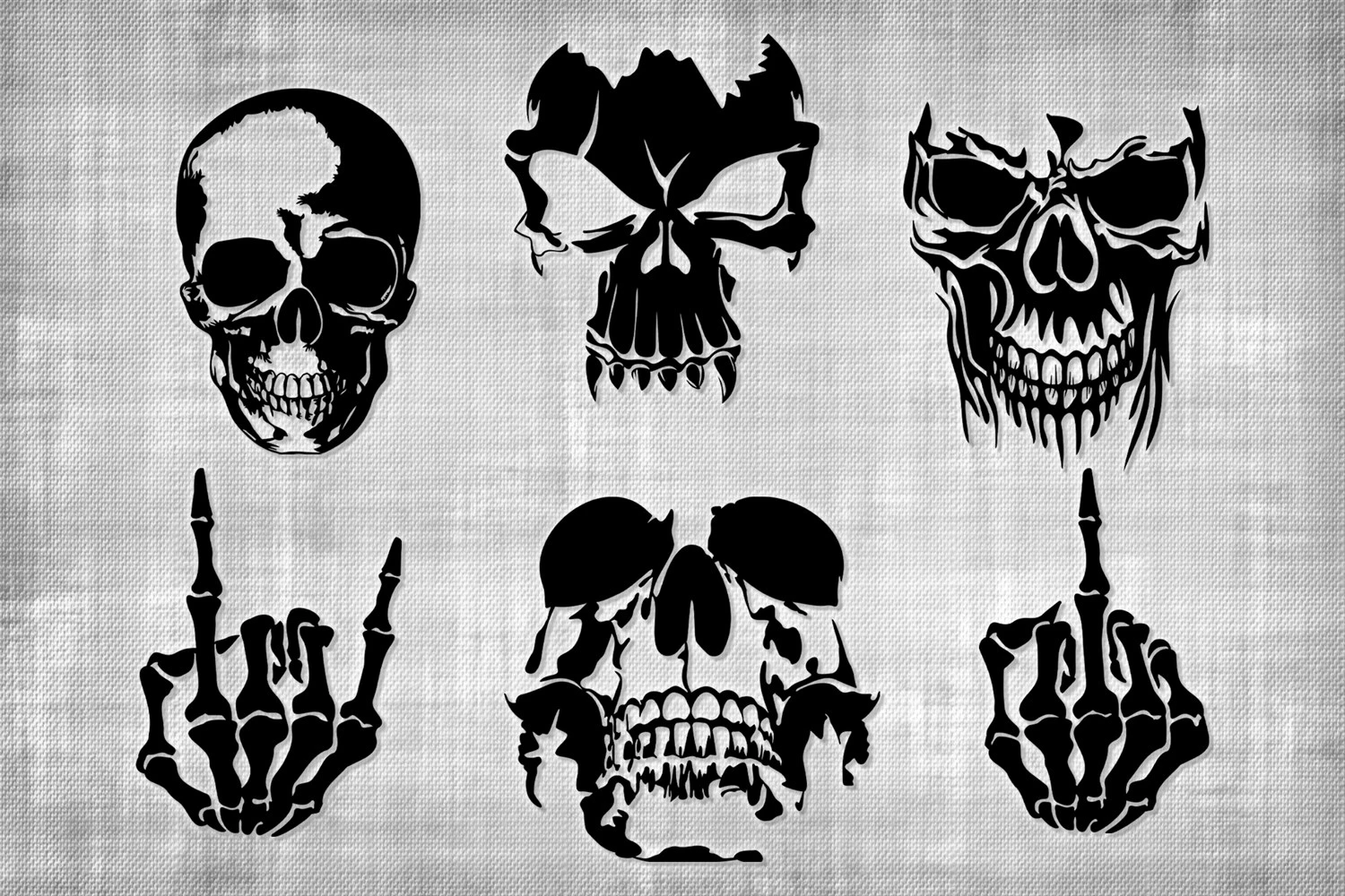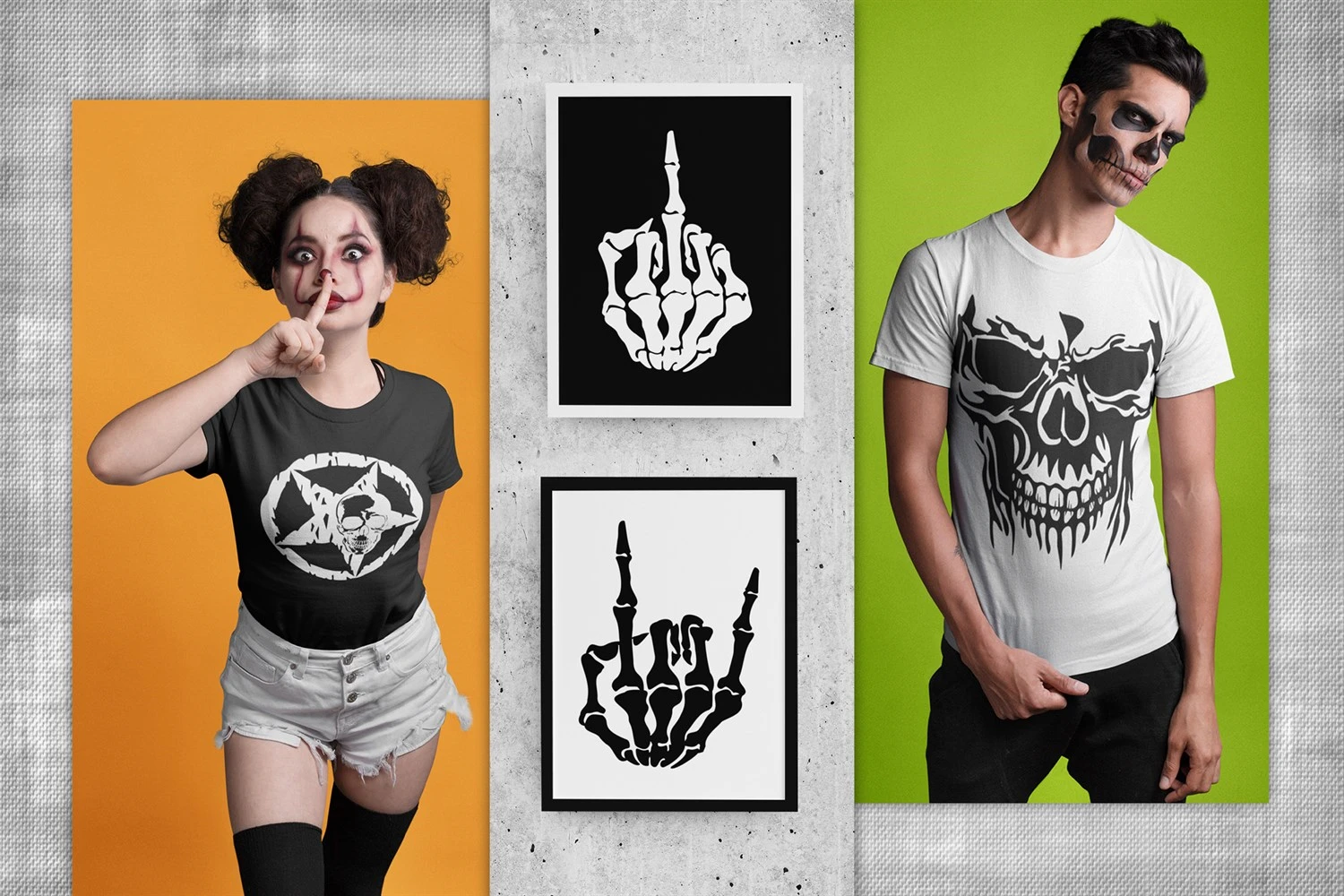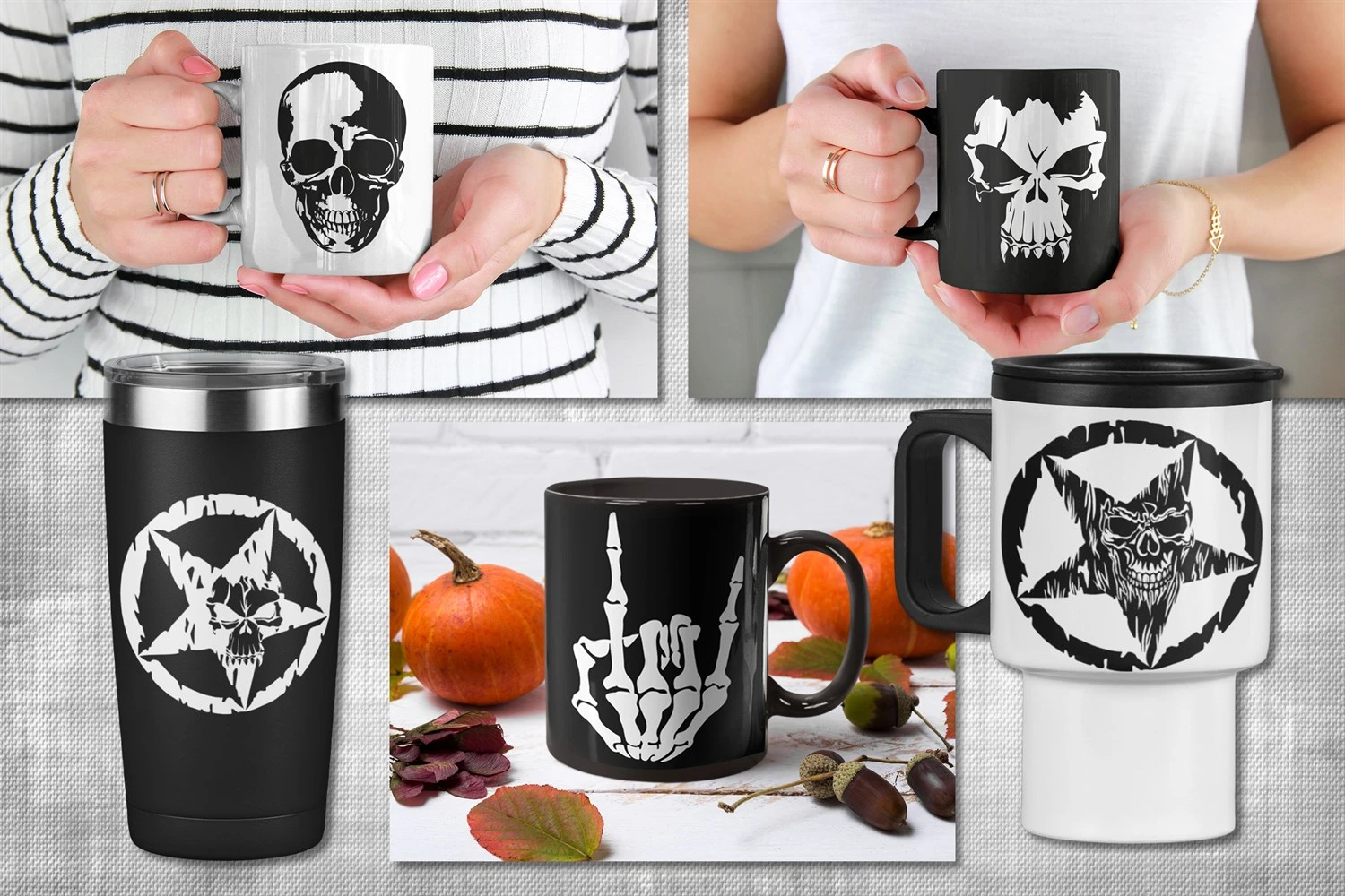 Halloween Skull and Skeleton Hand Silhouette SVG Cut Files for your creative DIY projects, and Home Decorations. Perfect for vinyl, personalized T-shirts, apparel, cups, stickers, card stock, and other DIY projects. Options are endless! The design comes in BLACK color which can be easily changed to your desired color.