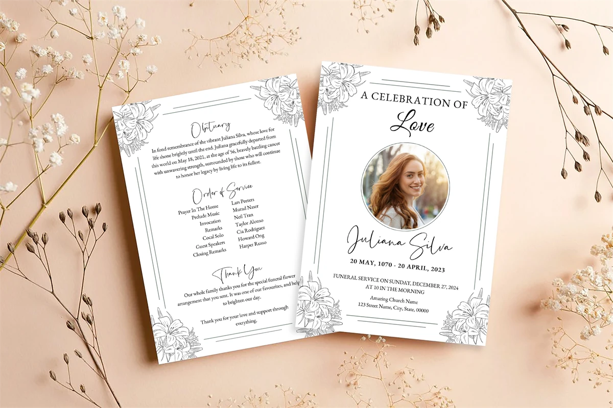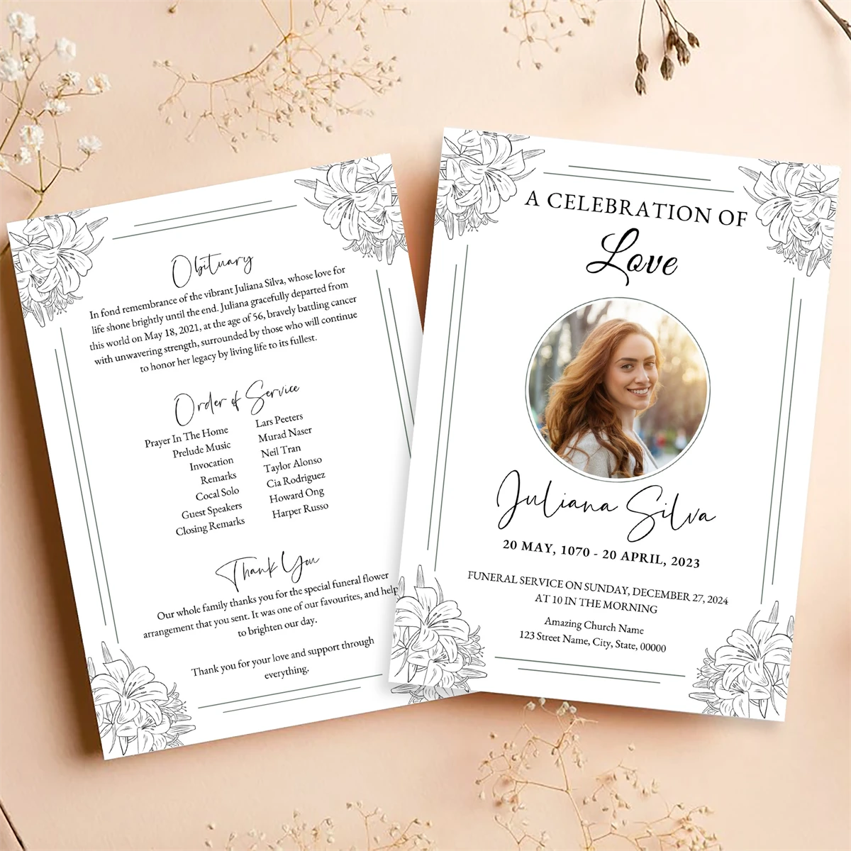 Minimalist Funeral Program Template, Simple Funeral Memorial Program, Funeral program, Funeral program template for woman, Funeral announcement, Funeral program template canva, Funeral program with line art flower.