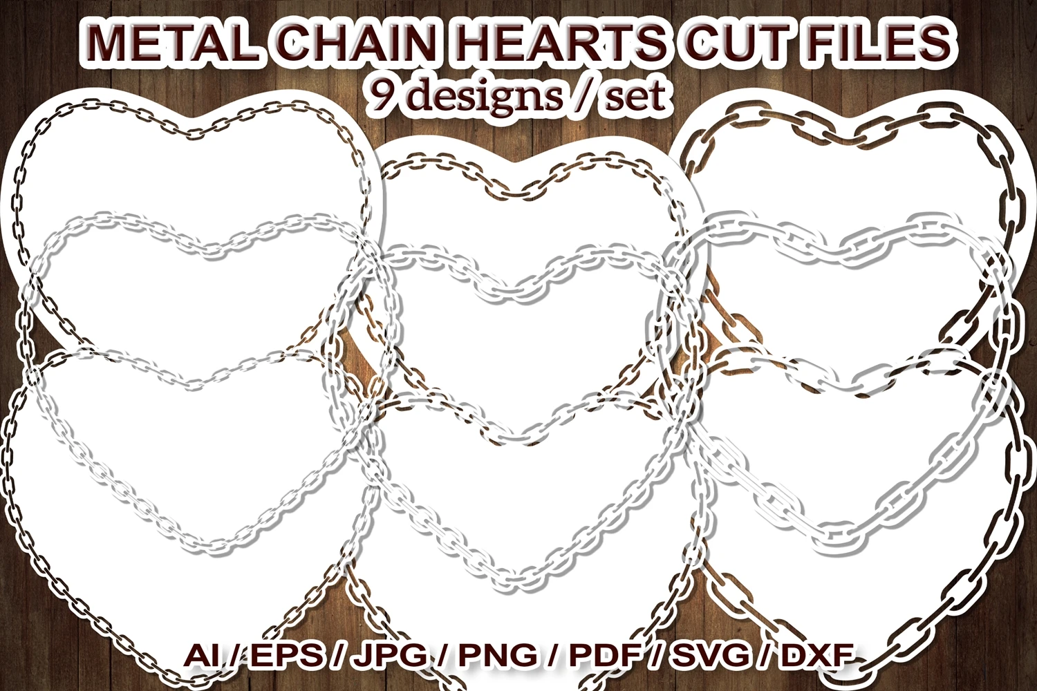 Simple Metal Chain Style 9 designs heart shape border frames, SVG Clipart Cut Files for your creative DIY projects and Wedding Decor, or Home Decorations. Perfect for the papercut, scrapbooking, card stock, home decor, wedding decor, and other DIY projects. Options are endless! All designs are about 6x7 inches and come in black color which can easily change the color as your desire.