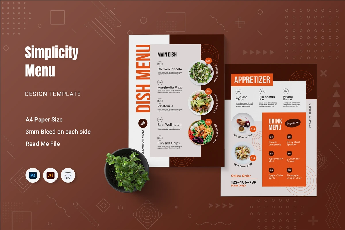 Utilizing enchanting imagery and versatile ordering options, you possess the capability to construct a menu that is equally unforgettable as the cuisine you provide. Let's generate a positive initial impact by selecting our template for your menu.