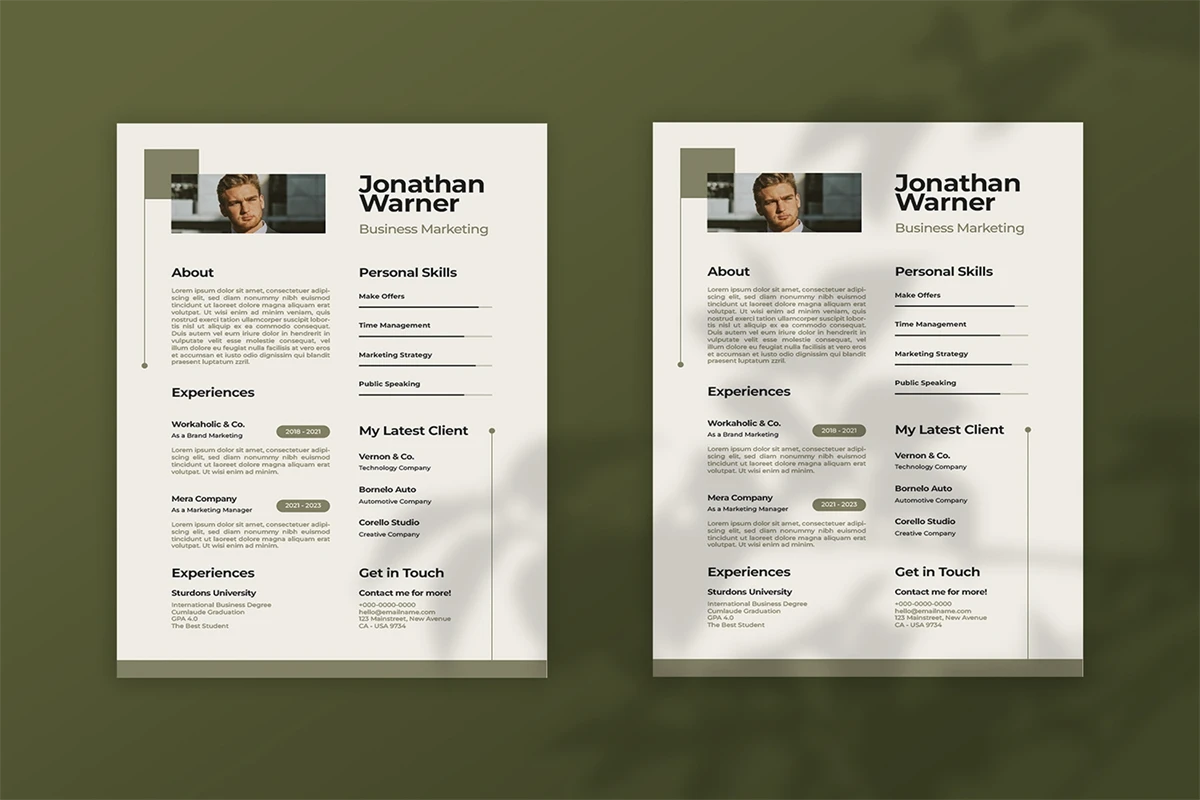 This CV resume design template lets you tell your story to potential employers or collaborators by showcasing your skills, experience, and accomplishments. It presents your credentials clearly and professionally to draw attention and highlight your strengths.