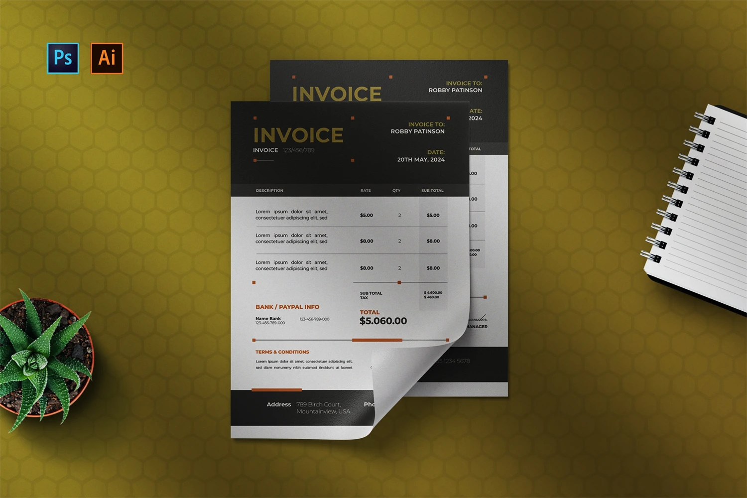 professional, up-to-date invoice templates that can be used for personal, business, or company billing. You can easily change these template files. You can quickly change the text, fonts, and colors with just a few clicks to create your own content and color scheme. This invoice template will make it easy and quick for you to make an invoice.